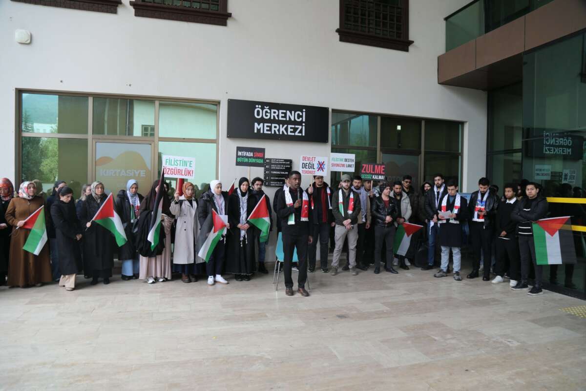 Basın açıklamasında konuşan BTÜ Öğrenci Fikir Platformu öğrencilerinden Ahmet Akif Şahin yaptığı açıklamada, “7 Ekim bir başlangıç tarihi değil, bir dönüm noktasıdır. Bu tarih yıllardır süregelen sistematik işgale karşı Filistin halkının meşru müdafaa hakkını kullandığı tarihtir. Yaşadığımız süreç bize dünyanın ikiyüzlülüğünü gösterdi. Ne Arap dünyası, ne İslam ülkeleri, ne de her fırsatta insan haklarından dem vuran Avrupalı Kimse bu soykırıma karşı aksiyon almadı. Yürüyüşler ve açıklamalardan ziyade bir şey göremedik. Vicdanlı insanlar olarak elimizden geleni yaptık, eylemlere katıldık, ancak koltuk sahibi insanlar çağrılarımıza kulak vermediler. Biz bir kez daha yüksek sesle haykırıyoruz. Öğrenciler olarak üzerimize düşen vazifeyi yerine getiriyoruz. Devletleri ve uluslararası örgüt ve teşkilatları aksiyon almaya çağırıyoruz. Aksiyon almadıkça, tepki göstermedikçe, bu soykırım engellenmedikçe söylenecek her söz boş laftan ibarettir. Ölüyoruz kardeşlerim, ruhumuz eriyor, yüreklerimiz sökülüyor yerinden. Bebek katillerine karşı elimizden geldiğince mücadeleye devam edeceğiz. Etmek zorundayız. İnsanlar ölüyor, bebekler katlediliyor. Aileler nüfustan siliniyor. Son teknoloji silahlarla saldırılıyor Gazze’ye. Gazze’yi unuttuğumuz her an için yazıklar olsun bizlere! Gazzeli bebeklerin o küçücük bedenlerinin üzerine yağdırılan bombalara bir kuruşumuz dahî giderse yazıklar olsun. Parayı çok seven bu yapıya karşı ekonomik gücümüzü kullanmak, boykota devam etmek zorundayız. İsrail’e maddi olarak, yahut söylemleriyle destek veren hiçbir markadan alışveriş yapmayacağız. Yarın Hakk’ın divanında bizler, üzerine düşeni yapmış, onurlu gençler olarak bulunmak isteriz. Ümitvar olacağız, zalime karşı dimdik duracağız. Çalışacağız, çalışacağız, çalışacağız. Hız ve haz çağında biz gençleri uyuşmuş beyinler, kararmış kalpler haline getirmeye çalışanlara karşı uyanık olacağız. Okuyacağız, kendimizi geliştireceğiz. Çalışacağız. Bu bizim cihadımızdır” ifadelerini kullandı.