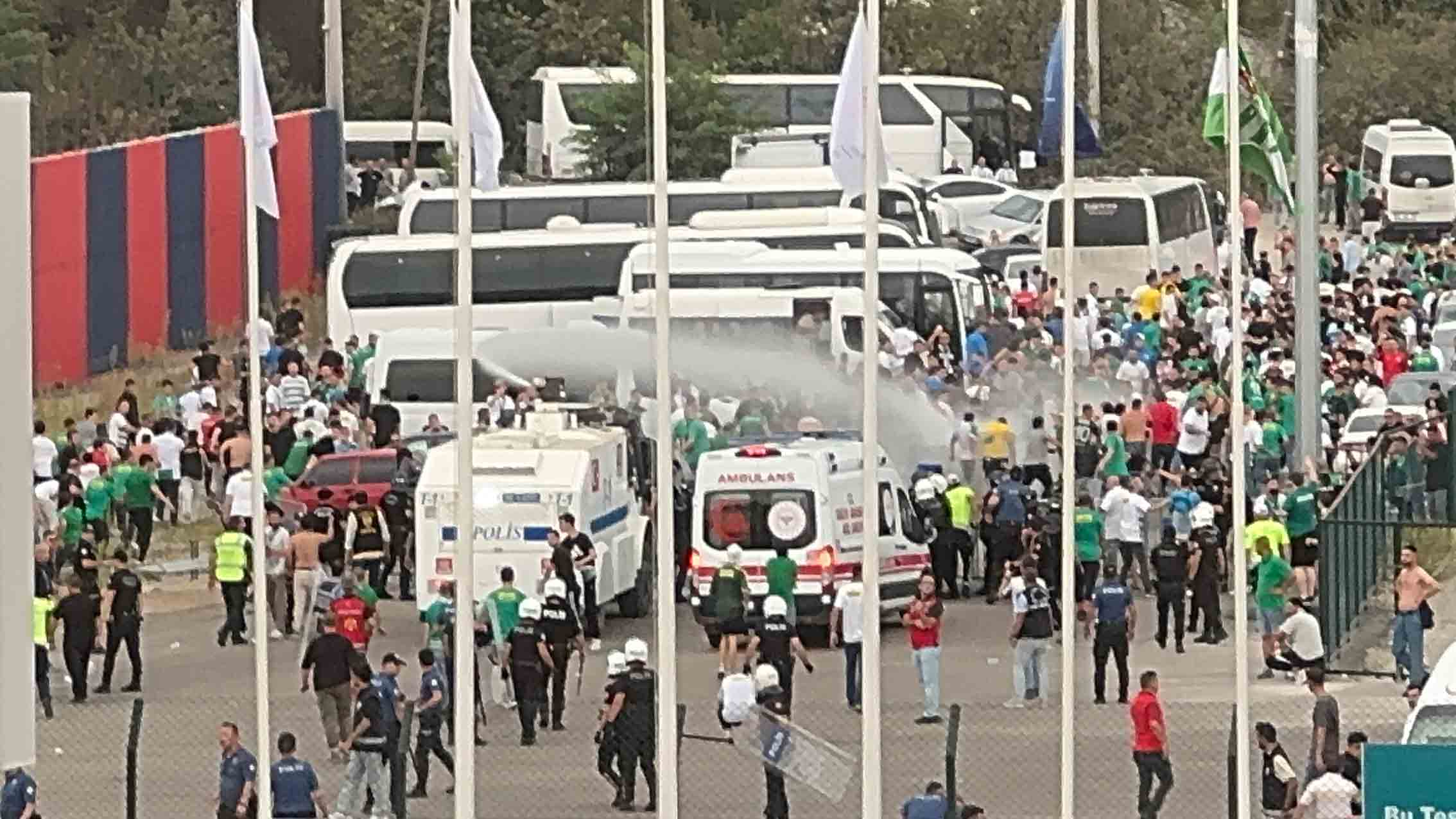 Türkiye Futbol Federasyonu 3. Lig açılış maçında Düzcespor, evinde Bursaspor’u ağırladı. Mücadele Bursaspor’un 2-0 üstünlüğü ile sona ererken, Bursaspor taraftarlarının çıkardığı olaylar ile ilgili Düzce Valiliği’nden açıklama yayınlandı. Yapılan açıklamada 450 kontenjan verilen Bursaspor taraftarlarının şehre daha kalabalık geldiği belirtilen açıklamada, “07.09.2024 günü saat 16.00’da oynanan Düzcespor – Bursaspor müsabakasına kulüplerimizin ortak talebi doğrultusunda il Spor Güvenlik Kurulu kararı ile stadyum kapasitesinin %10’u oranında (450) misafir takim seyircisi için yer ayrılması kararlaştırılarak kulüplere bildirilmiştir. Ev sahibi kulüp tarafından (450) bilet tahsis edilmesine karşın müsabakayı izlemek için (1200) Bursaspor taraftarı stadyuma gelmiştir. Stadyumun misafir takım trübününün fiziki kapasitesi olan (450) seyircinin maç saati öncesinde kontrolleri yapılarak müsabakaya girişleri sağlanmıştır. Biletsiz ya da aynı seri numarasi içeren fotoğraf kartına basılmış taklit biletle stadyuma girmeye çalışan taraftarlara misafir takım trübününün dolduğu, stadyuma alınamayacakları defaten iletilmiştir. Ancak dışarda bulunan bazı taraftarların dış güvenlik bariyerini aşarak stada girme teşebbüsünde bulunmalar üzerine yaşanan arbede sırasında istenmeyen bazı olaylar meydana geldiği gözlemlemiştir. Yaşanan olayların çok yönlü olarak incelenmesi için idari tahkikata başlanılmış olup zor kullanma yetkisini aştığı değerlendirilen (1) personel görevden uzaklaştırılmıştır” denildi.
