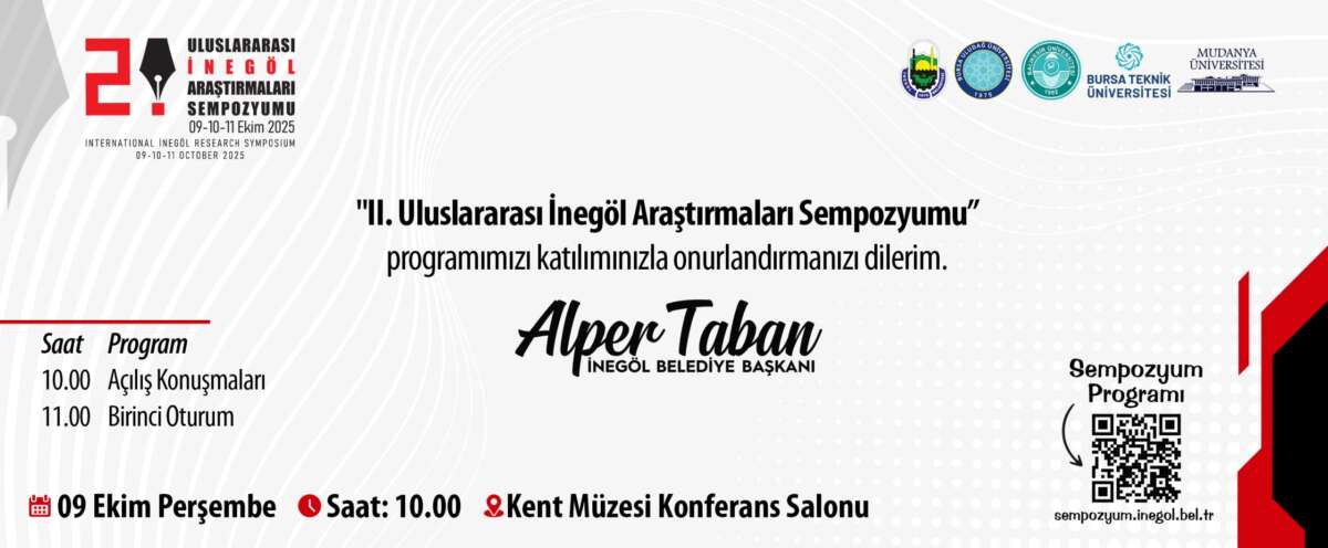 İnegöl Belediyesi’nin kuruluşunun 155’inci yılı anısına, İnegöl Belediyesi tarafından 2. Uluslararası İnegöl Araştırmaları Sempozyumu düzenleniyor. Uludağ Üniversitesi, Bursa Teknik Üniversitesi, Mudanya Üniversitesi ve Balıkesir Üniversitesi iş birliğiyle 9 Ekim Perşembe günü başlayıp; 10 Ekim Cuma ve 11 Ekim Cumartesi günleri devam edecek sempozyum öncesi Belediye Başkanı Alper Taban bir açıklama yaparak vatandaşları davet etti.
