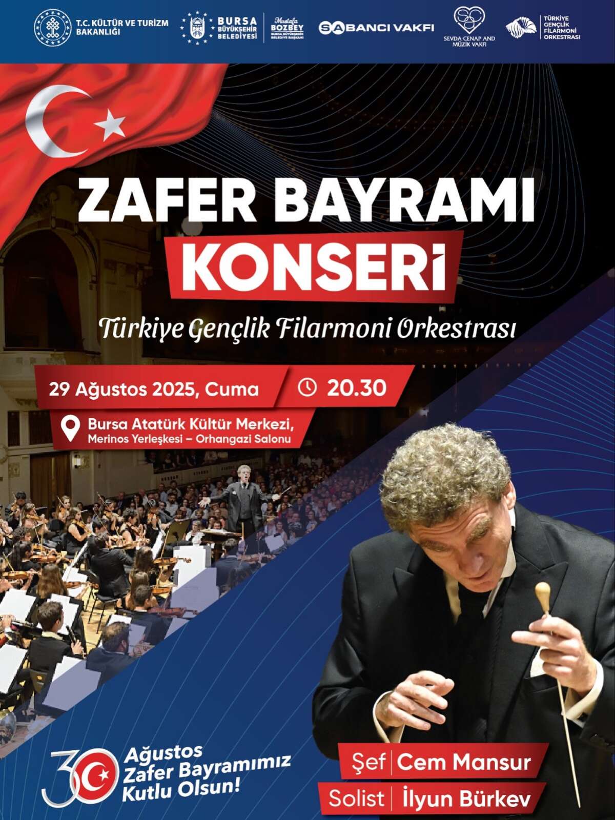 “Bir Zafer Var” temasıyla düzenlenecek kutlamalar kapsamında 29 Ağustos Cuma günü saat 20.30’da Atatürk Kültür Merkezi Merinos Yerleşkesi’nde Türkiye Gençlik Filarmoni Orkestrası, saat 21.00’de ise Kurşunlu Tahtalı Çarşı’da Çalgıcı Mektebi Orkestrası sahne alacak.