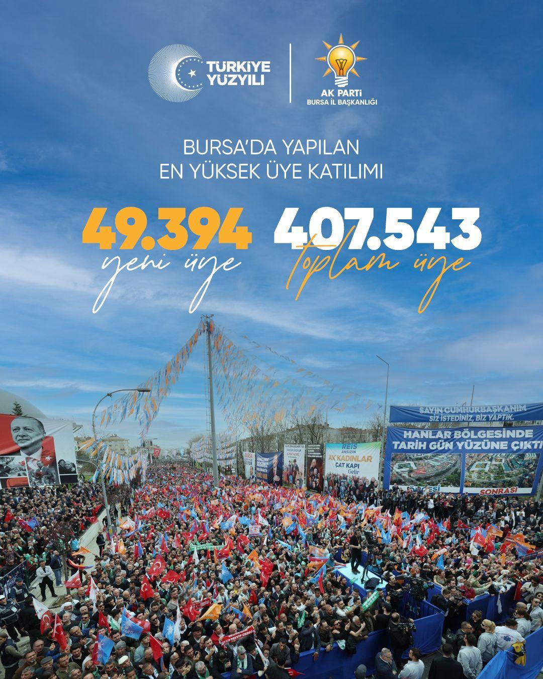 “Cumhurbaşkanımız, Genel Başkanımız Sayın Recep Tayyip Erdoğan’ın liderliğinde; milletimizle kurduğumuz gönül bağının, güvenin ve istikrarın en somut göstergesi olan üye sayımızı Bursa’da rekor seviyeye taşıdık.