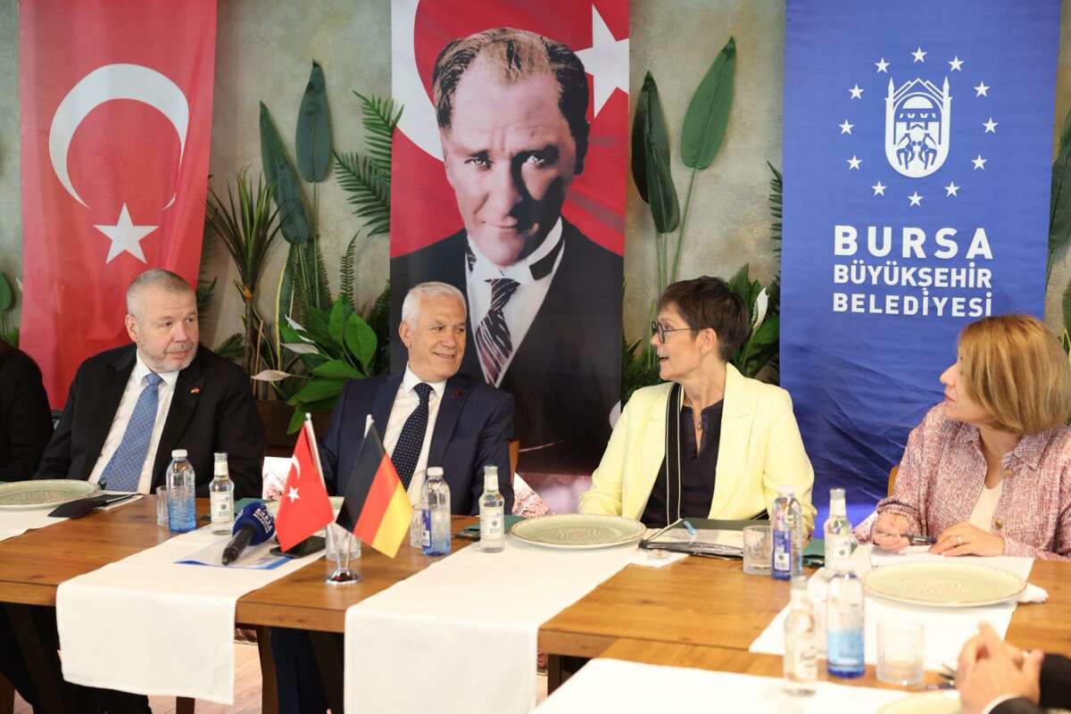 Bursa’da vatandaşların talep ve önerilerini yerinde dinleyerek çözüm üretmek amacıyla düzenlenen ‘Başkan Bozbey Burada’ projesi kapsamında İnegöl’de çeşitli temaslarda bulunan Büyükşehir Belediye Başkanı Mustafa Bozbey, Almanya Federal Cumhuriyeti Rheinland-Pfalz Eyaleti Ekonomi, Ulaştırma, Tarım ve Bağcılık Bakanlığı Devlet Sekreteri Petra Dick-Walther ve beraberindeki heyeti Gastro İnegöl’de ağırladı. Samimi bir ortamda gerçekleşen ziyarette, yerel üreticiler ile uluslararası aktörler arasında kurulacak yeni iş birlikleri ele alındı.