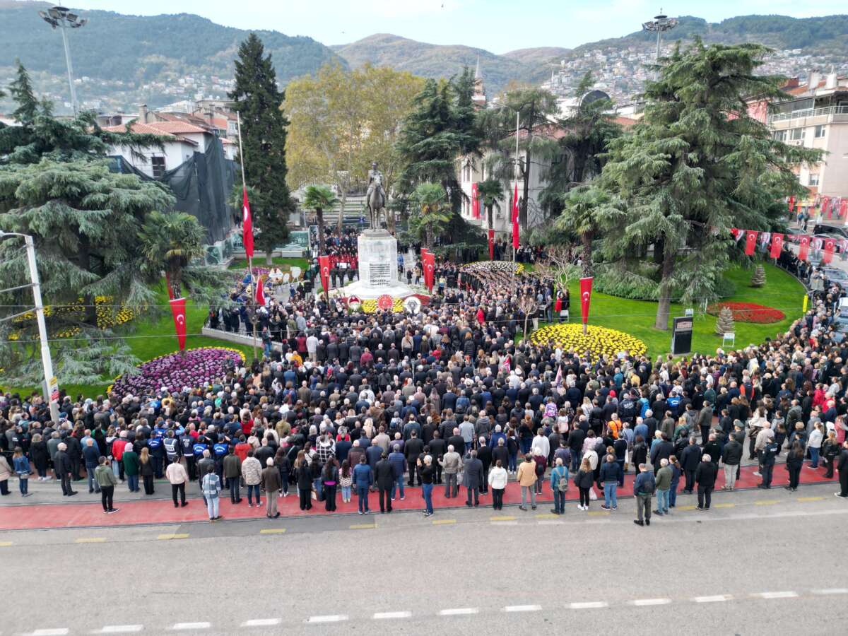Bursa Valiliği tarafından Heykel’de düzenlenen anma programı, Bursa Valiliği, Bursa Büyükşehir Belediyesi ve Garnizon Komutanlığı’na ait çelenklerin Atatürk Heykeli’ne sunulmasıyla başladı. Saatler 09.05’i gösterdiğinde sirenlerin çalmasıyla birlikte Bursa’da hayat bir dakikalığına tamamen durdu. Vatandaşlar araçlarından inerek saygı duruşunda bulundu. Bazı vatandaşlar da törene cam ve balkonlarından eşlik etti. Saygı duruşu ve İstiklâl Marşı’nın okunmasının ardından Bursa Valisi Erol Ayyıldız, Büyükşehir Belediye Başkanı Mustafa Bozbey ve protokol üyeleri Büyükşehir Belediyesi tarafından Heykel UNESCO Meydanı’nda açılan ‘Bitmeyecek Kalbimizde Yolculuğun Sonsuza Dek’ sergisini gezdi. Vali Erol Ayyıldız, Büyükşehir Belediye Başkanı Mustafa Bozbey ve protokol üyeleri daha sonra Tayyare Kültür Merkezi’nde Özlüce Şehit Aykut Yurtsever Anadolu Lisesi öğrencilerinin sahnelediği ‘Türk’ün Destanı Atatürk’ oratoryosunu izledi.