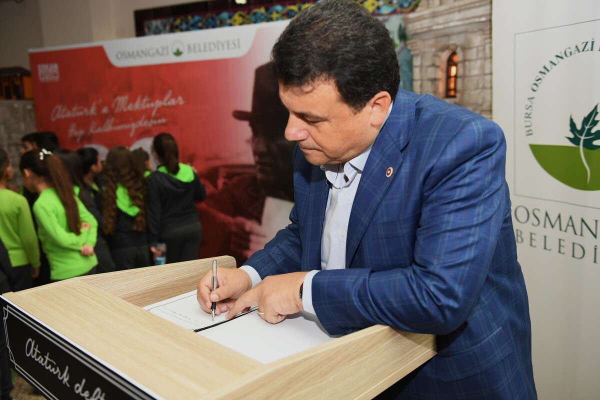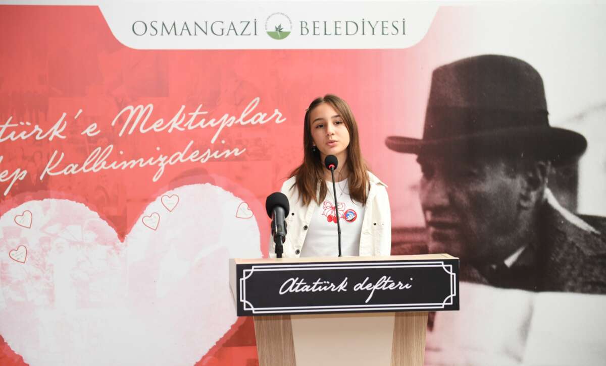 Büyük Önder Mustafa Kemal Atatürk’e sevgi ve bağlılığıyla bilinen Osmangazi Belediye Başkanı Erkan Aydın, hayata geçirdiği Atatürk Defteri projesiyle bunu bir kez daha gözler önüne serdi. Osmangazi Belediyesi’nin kütüphanelerine gelerek ders çalışan çocuklar kütüphaneye geldiklerinde Atatürk’e olan duygu ve düşüncelerini içeren mektuplar yazarak kütüphanelere teslim etti. Atatürk’e yazılan mektuplar 25 adete ulaşınca Başkan Erkan Aydın, bu mektupların bir kitapta toplanmasını istedi. Oluşturulan Atatürk Defterine çocukların yazdığı mektuplar tek tek aktarıldı. Atatürk Defteri düzenlenen törenle Osmangazi Belediyesi’nin girişine konuldu. Osmangazi Belediyesi’ne gelen tüm misafirler Atatürk’e duygu ve düşüncelerini artık Atatürk Defterine yazabilecek.