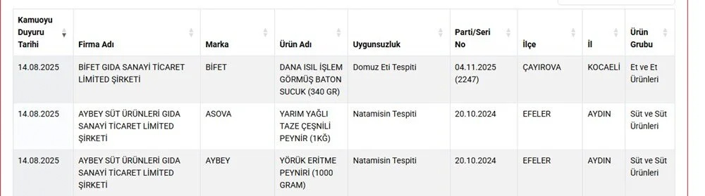 31 Temmuz’da açıklanan önceki listede salamında domuz eti bulunduğu belirlenen, zincir marketlerde de satılan ünlü marka, bu kez de sucuğunda domuz eti tespitiyle gündeme geldi.