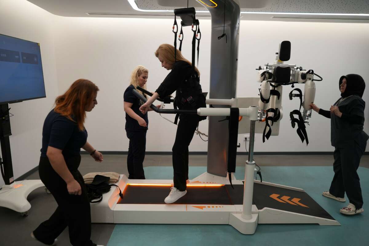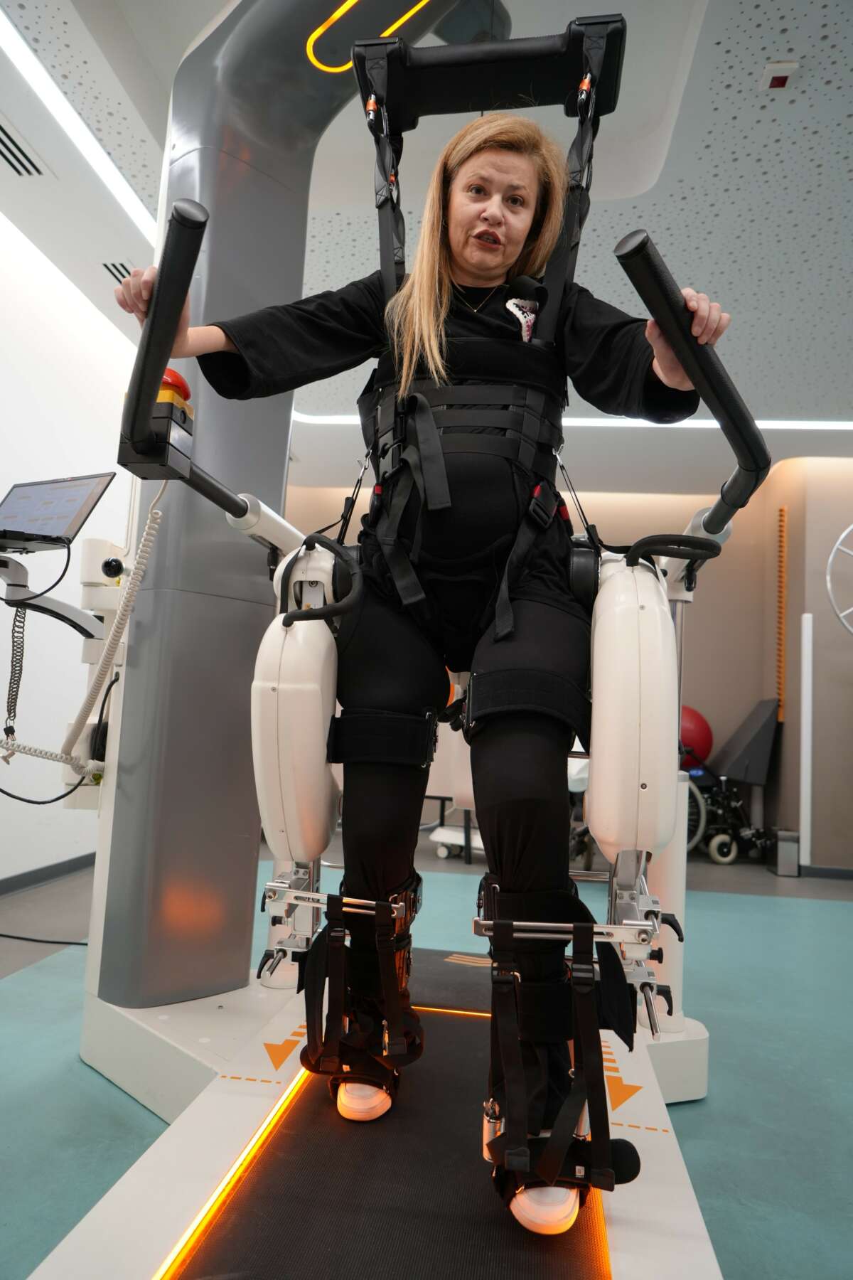 Yürümeye yardımcı robot ile yapay zeka destekli simülasyona bakarak yürüyüş yapan Karaburun, simülasyondaki yürüyüş yapan kız çocuğunun kendisine benzediğini bu sebeple bu simülasyonu tercih ettiğini söyledi.