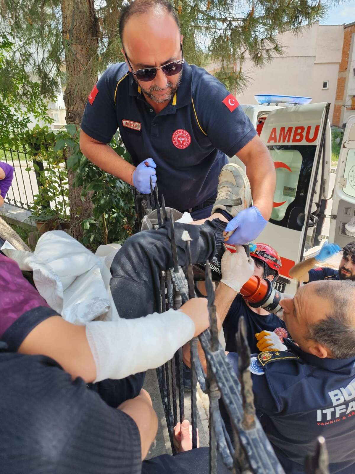 Bursa'nın İnegöl ilçesinde bahçe duvarından atlarken korumalık demiri bacağına saplanan çocuk, itfaiye ekiplerince kurtarıldı. Kurtarma anı ise saniye saniye kameraya yansıdı.