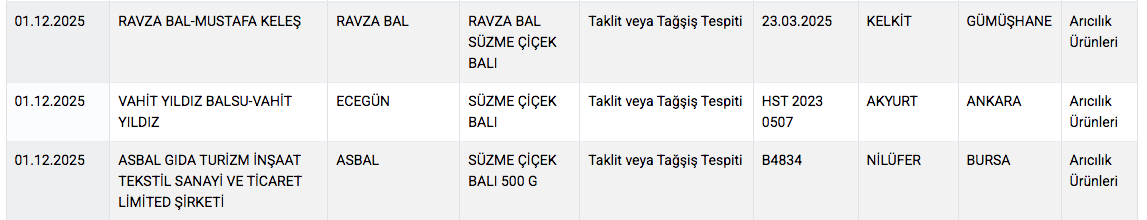Son güncellemede, “Taklit ve Tağşiş Yapılan Gıdalar” bölümüne üç yeni firma ve ürünü eklendi. Bu firmalar arasında, merkezi Bursa’nın Nilüfer ilçesinde bulunan Asbal Gıda Turizm İnşaat Tekstil Sanayi ve Ticaret Ltd. Şti. de yer aldı.