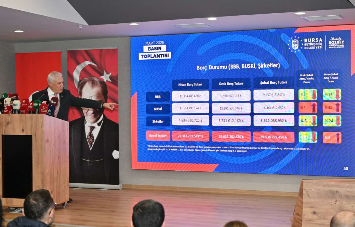 Su kaynaklarını korumak ve geleceğe güvenle taşımak için kararlı olduklarını vurgulayan Başkan Bozbey, sürdürülebilir su yönetimi politikalarını hayata geçirdiklerini ifade ederek, bu mücadelede herkese önemli görevler düştüğünü söyledi. BUSKİ’nin borçları hakkında da bilgi veren Başkan Bozbey, “Büyükşehir’in, BUSKİ’nin ve şirketlerin toplam borçları 29.5 milyar TL. Toplam borç üzerinden baktığımızda 2 milyar 300 milyon TL civarında borcu azalttık. Ancak BUSKİ’nin borcu artıyor. Nisan ayında 11 milyar 554 milyon TL olan borç Şubat ayında 16 milyar 464 milyon TL’ye yükseldi. Son yaşanan olumsuzluklardan dolayı kur 2 TL arttı. Her bir lira artışta BUSKİ’nin borcu 350 milyon TL civarında artıyor. 2 TL artınca 700 milyon TL BUSKİ’nin borcu yükseldi. Yüzde 75’i dövizli borç. Konsolide borçlara baktığımızda Nisan ayında 986 milyon dolardı, Şubat ayında 811 milyon dolara indirdik. Bunları tasarrufla, iyi bir mali disiplin uygulayarak, verimliliği artırarak başardık. BUSKİ’nin iç borcu 1 milyardan 896 milyon TL’ye düşerken, dış borcu 8 milyar 156 milyondan 13 milyar 488 milyona yükseldi.” dedi.