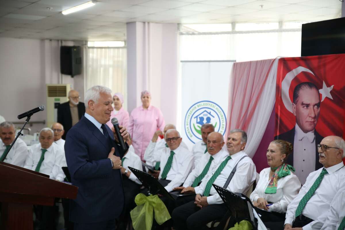 Bayramlaşmanın ardından huzurevi sakinlerinin oluşturduğu Türk Halk Müziği Korosu’nun mini konserini ilgiyle dinleyen Başkan Bozbey, eline mikrofonu alarak koroya eşlik etti. Program sonunda Huzurevi sakinleri, Aktif Yaşam Merkezleri atölyelerinde yapmış oldukları ürünleri Başkan Bozbey’e hediye etti. Ziyaret, Büyükşehir Belediye Başkanı Mustafa Bozbey’in anı defterini imzalaması ile sona erdi.