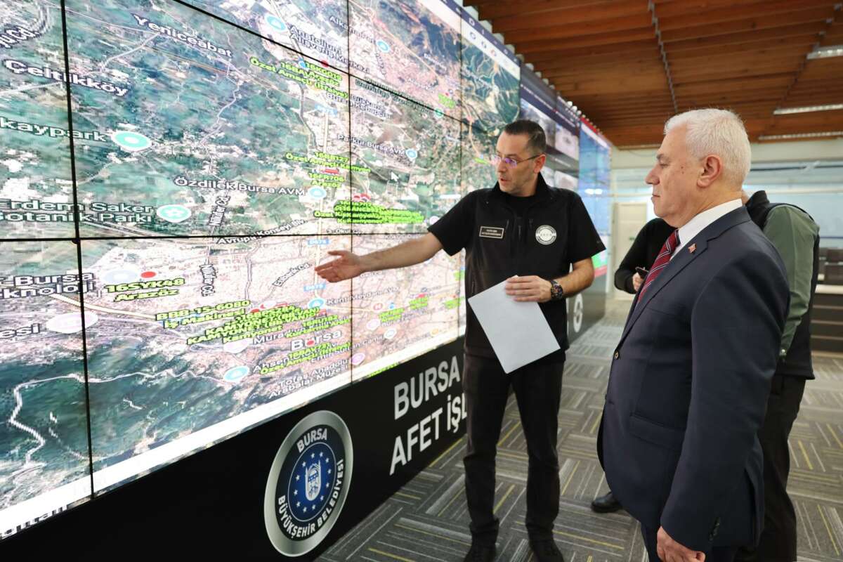 Bursa’da etkili olan şiddetli rüzgâr ve etkili yağışa karşı aralıksız çalışan Büyükşehir Belediyesi ekipleri, vatandaşların mağduriyet yaşamaması için olaylara hızlı bir şekilde müdahalede bulunuyor. Sahada görev yapan ekipleri ziyaret ederek çalışmalar hakkında bilgi alan Bursa Büyükşehir Belediye Başkanı Mustafa Bozbey, daha sonra Merinos Yerleşkesi’ndeki Afet Koordinasyon Merkezi’ne (AKOM) geçerek yetkililerle birlikte son durumu değerlendirdi.