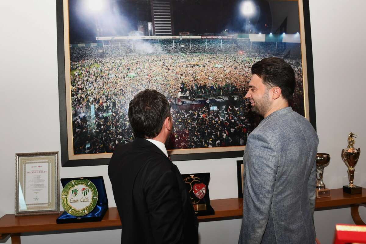 Osmangazi Belediye Başkanı Erkan Aydın’ı Bursaspor Kulübü’nde misafir ettiklerini belirten Bursaspor Başkanı Enes Çelik, “Sağ olsun Erkan başkanımız sürecin en başından bugüne kadar her zaman yanımızda oldular. Çocukların Bursasporlu olması için yaptığı projelerle gençlerimizi maçlara getiriyor. Ben de bu konuda başkanımız Erkan Aydın’a çok teşekkür ediyorum her zaman kapımız kendilerine açıktır” şeklinde konuştu.