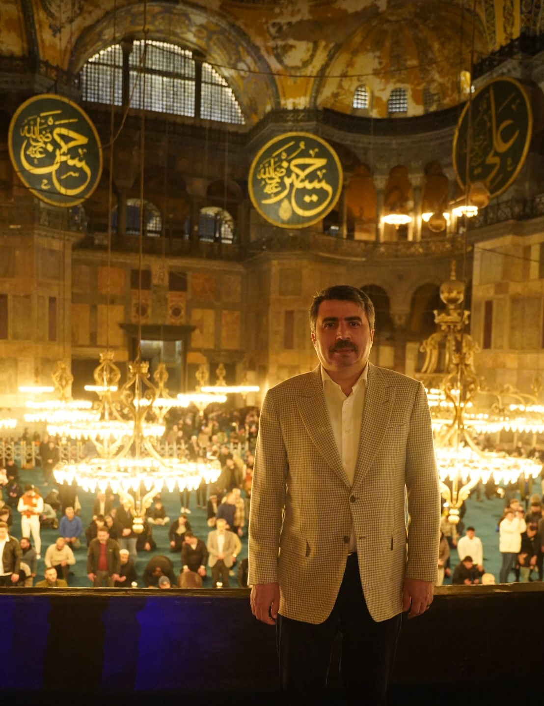 Kararlılığı ve dirayetiyle 86 yıllık suskunluğu bozarak Ayasofya’yı özüne döndüren liderimiz, Cumhurbaşkanımız Sayın Recep Tayyip Erdoğan’a şükranlarımı sunuyorum.”