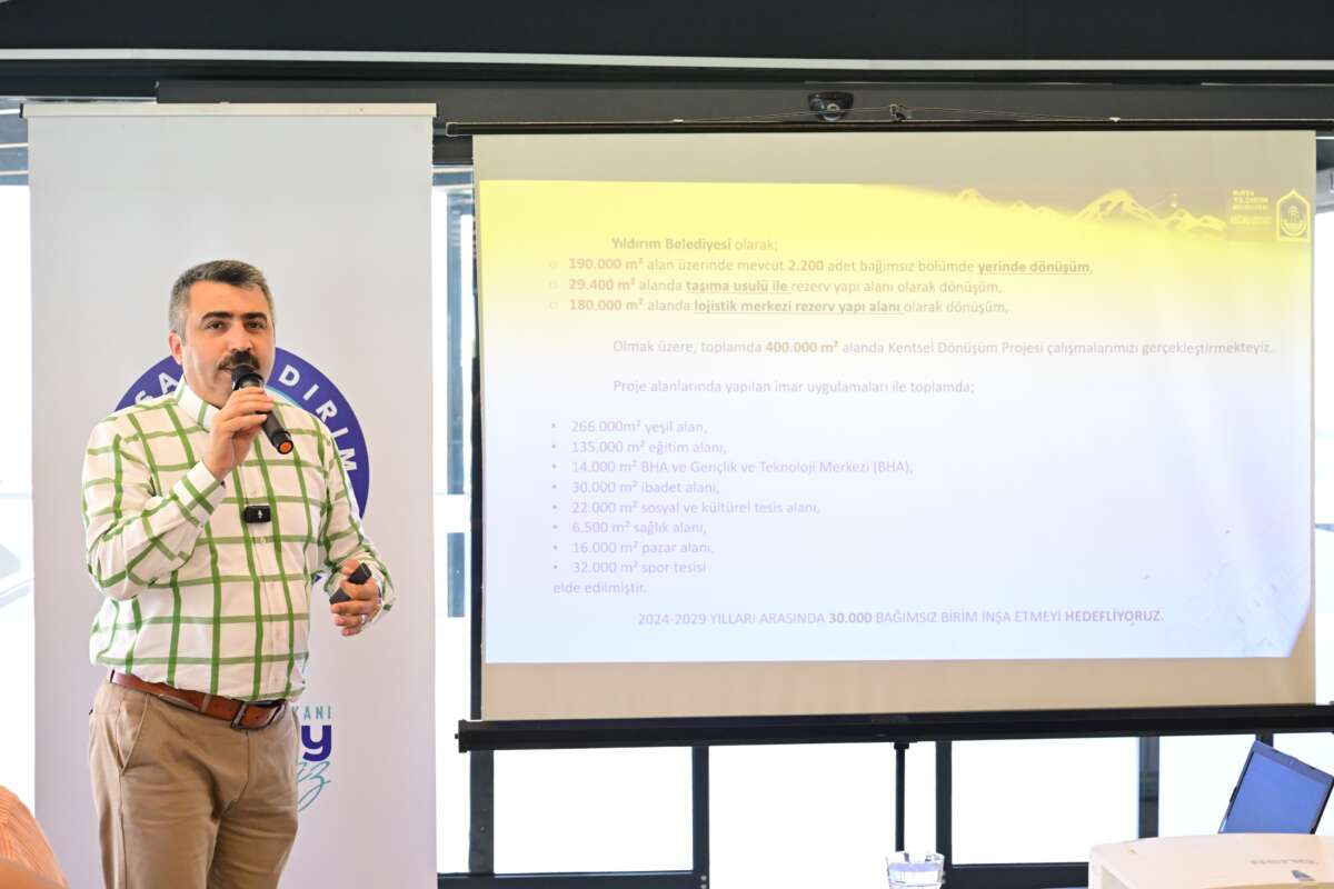 Yıldırım Belediyesi’nin kentsel dönüşüm alanında Bursa’nın en tecrübeli kurumu olduğunu ve örnek teşkil ettiğini vurgulayan Başkan Yılmaz, “Bu başarının temelinde ise ortak akıl ve istişare kültürü yatıyor. Projeye başlarken uzlaşma oranını en üst seviyeye çıkarmaya çalışıyoruz. Yine kent dinamikleri, akademik odalar, sivil toplum kuruluşları, sektör temsilcileriyle istişare içerisinde kararlar alıp uyguluyoruz. Bitişik nizamdan ayrık nizam yapılara geçerek yeni bir kültür oluşturuyoruz. Bu projeleri belirlerken de bölgesel özellikleri ve beklentileri esas alıyoruz. Bugüne kadar 190 bin metrekare alandaki 2 bin 200 bağımsız bölümde yerinde dönüşüm 29 bin 400 metrekare alanda ise taşıma usulü dönüşüm gerçekleştirdik. Bu toplantıyı bundan dolayı çok önemsiyor ve yeni iş birliklerine temel teşkil etmesini umuyorum” diye konuştu.