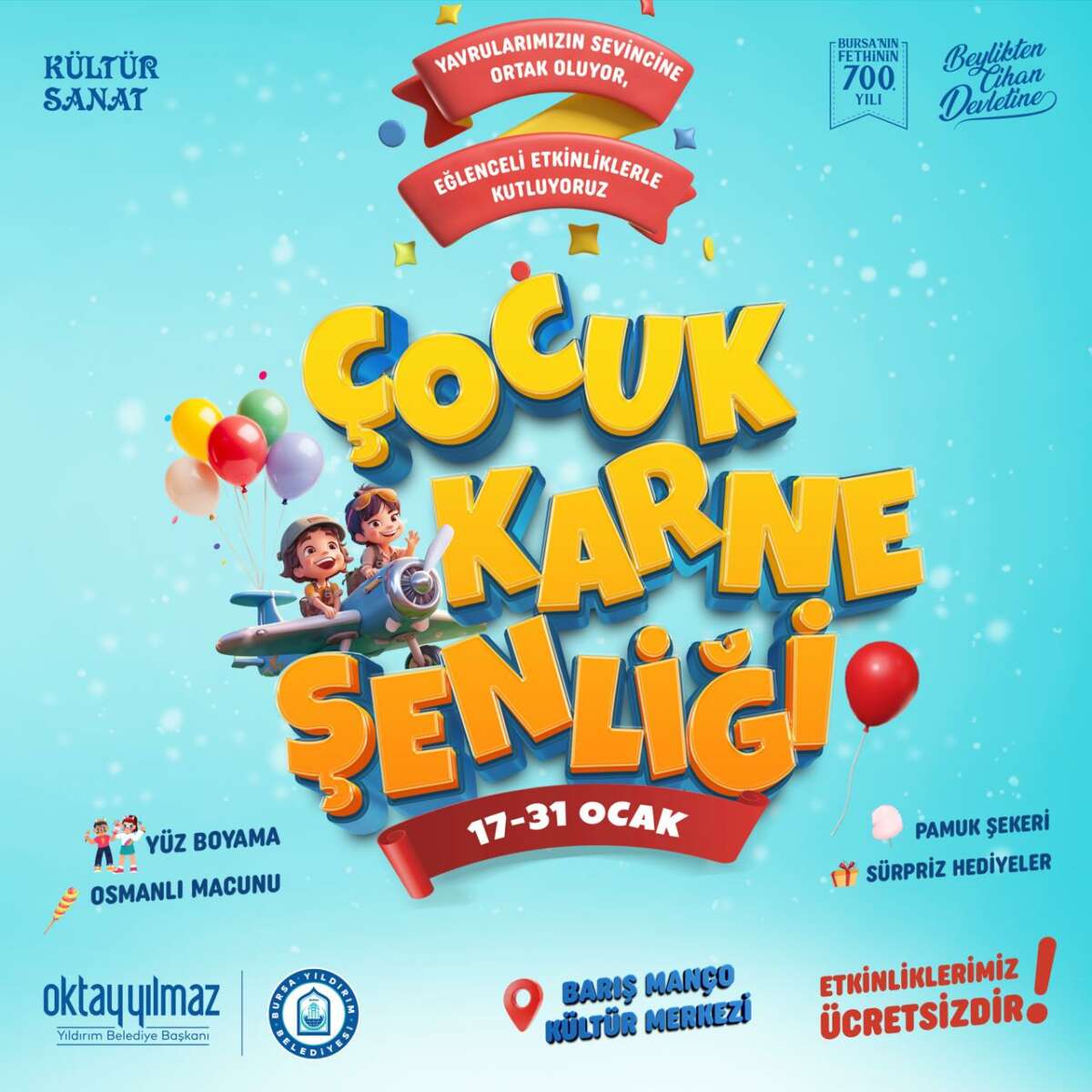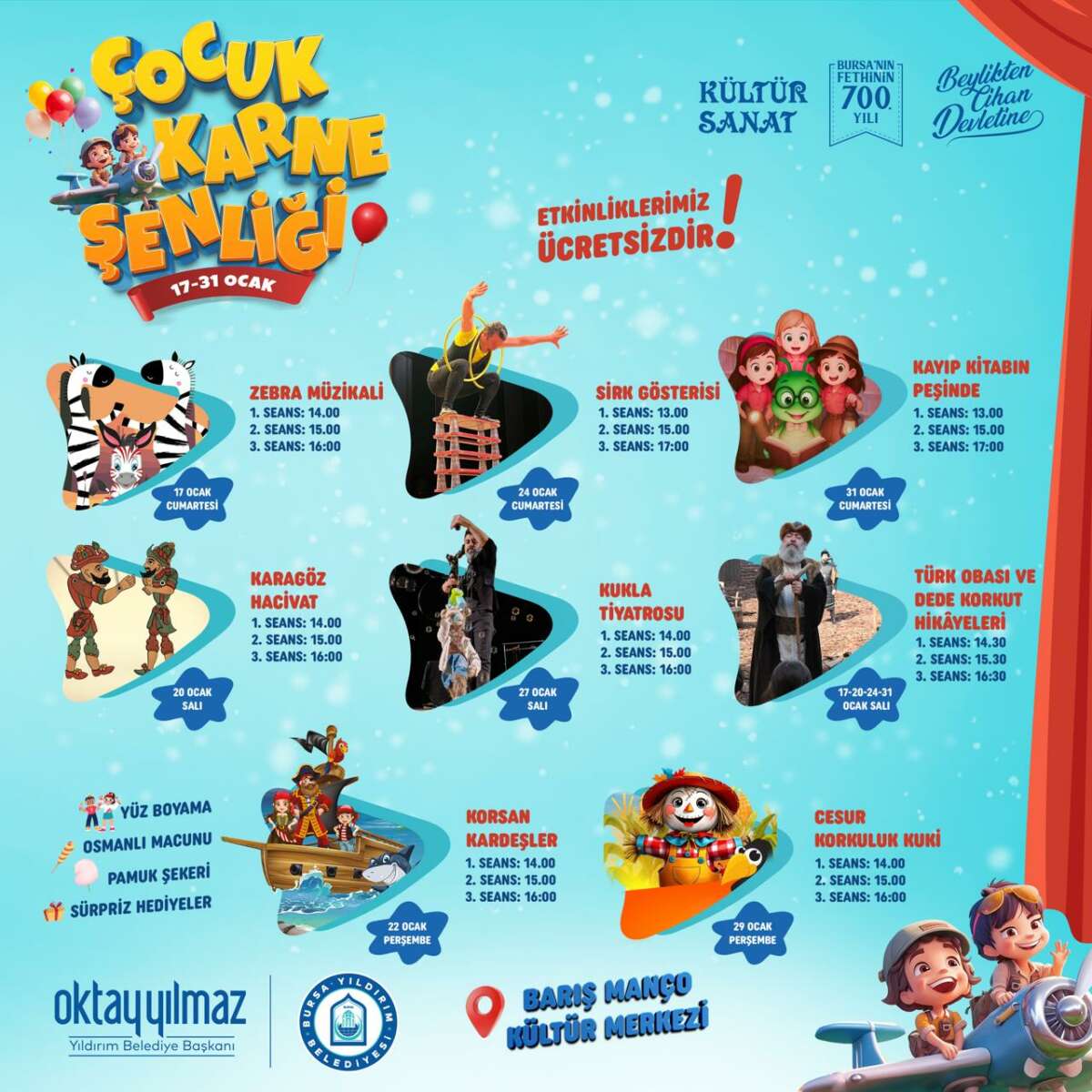 Yıldırım Belediyesi Kültür Sanat ve Sosyal İşler Müdürülüğü, çocukların dolu dolu bir tatil geçirmeleri için 17-31 Ocak tarihleri arasında Karne Şenliği düzenliyor. Barış Manço Kültür Merkezi’nde düzenlenen şenliklerde biribirinden eğlenceli etkinlikler ücretsiz şekilde çocuklarla buluşacak. Karne Şenlikleri kapsamında; 17 Ocak’ta Zebra Müzikali, 20 Ocak’ta Hacivat ve Karagöz oyunu, 22 Ocak’ta Korsan Kardeşler oyunu, 24 Ocak’ta sirk gösterisi, 27 Ocak’ta kukla tiyatrosu, 29 0cak’ta Cesur Korkuluk Kuki oyunu, 31 Ocak’ta Kayıp Kitabın peşinde oyunu ve 17-20-24-31 Ocak’ta ise Türk Obası ve Dede Korkut Hikayeleri çocuklarla buluşacak.