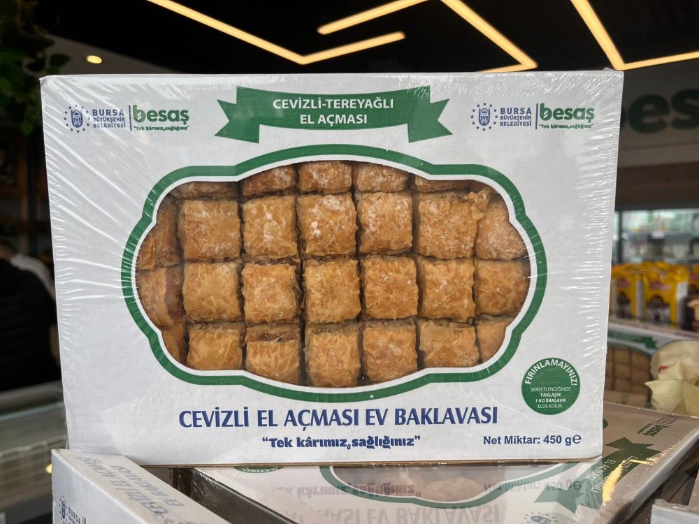 Bursa’nın Yenişehir ilçesinde üretilen cevizli baklavalar yarım kiloluk tepsilerde BESAŞ satış merkezlerinde satışa sunuldu. İlk etapta 10 adet üretilen cevizli baklavalara yoğun ilgi gösterilince 2 günde tükenme noktasına geldi. Ek siparişle 5 bin adet daha üretilen cevizli baklava arife gününde de kapışıldı.