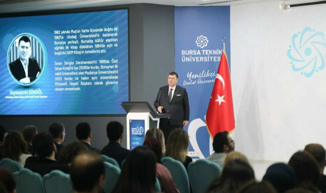 BTÜ Konuşmaları’nın 4’üncü sezon 34’üncü bölüm konuğu Mudanya Üniversitesi Mütevelli Heyeti Başkanı Gıyasettin Bingöl oldu. Mimar Sinan Yerleşkesi Turkuaz Salon’da gerçekleşen programa; BTÜ Rektörü Prof. Dr. Naci Çağlar, Rektör Yardımcıları Prof. Dr. Beyhan Bayhan, Prof. Dr. Sinan Uyanık ve Prof. Dr. Barış Tamer Tonguç, akademik ve idari personel ile öğrenciler katıldı. “Kendi Geleceğini Şekillendir: Hayaller, Hedefler ve Azim” başlıklı konuşmasını yapan Gıyasettin Bingöl, ekonomik ve sosyal imkansızlıklar içerisinde eğitim hayatını tamamladıktan sonra adım adım kariyerini nasıl gerçekleştirdiğini anlattı. Çok çalışarak ve bedeller ödeyerek, 1980 yılında Bursa’nın ilk kültür eğitim kitabevi BKM’yi açtıklarını ifade eden Gıyasettin Bingöl, “Onca zorluğun üstesinden gelerek açtığımız bu kitapevinden sonra bir adım daha atarak, Bursa Kitapçılar Çarşısı’nı kurduk. 13 farklı kitapçının yer aldığı bu merkez, üniversitelilerin en çok tercih ettiği nokta oldu. Üzerine kitap toptancılığını eklediğimiz bu kariyer yolculuğumuz; dershaneler, kolejler ve bugün son olarak Mudanya Üniversitesinin kuruluşu ile devam etti” diye konuştu.