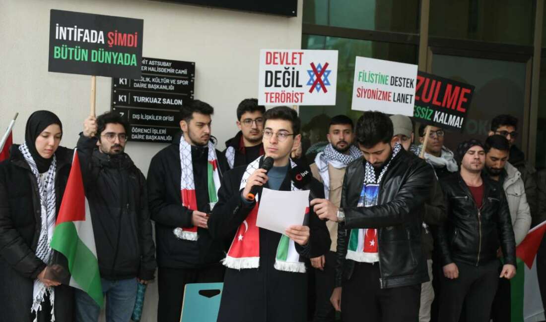 Basın açıklamasında konuşan BTÜ Öğrenci Fikir Platformu öğrencilerinden Ahmet Akif Şahin yaptığı açıklamada, “7 Ekim bir başlangıç tarihi değil, bir dönüm noktasıdır. Bu tarih yıllardır süregelen sistematik işgale karşı Filistin halkının meşru müdafaa hakkını kullandığı tarihtir. Yaşadığımız süreç bize dünyanın ikiyüzlülüğünü gösterdi. Ne Arap dünyası, ne İslam ülkeleri, ne de her fırsatta insan haklarından dem vuran Avrupalı Kimse bu soykırıma karşı aksiyon almadı. Yürüyüşler ve açıklamalardan ziyade bir şey göremedik. Vicdanlı insanlar olarak elimizden geleni yaptık, eylemlere katıldık, ancak koltuk sahibi insanlar çağrılarımıza kulak vermediler. Biz bir kez daha yüksek sesle haykırıyoruz. Öğrenciler olarak üzerimize düşen vazifeyi yerine getiriyoruz. Devletleri ve uluslararası örgüt ve teşkilatları aksiyon almaya çağırıyoruz. Aksiyon almadıkça, tepki göstermedikçe, bu soykırım engellenmedikçe söylenecek her söz boş laftan ibarettir. Ölüyoruz kardeşlerim, ruhumuz eriyor, yüreklerimiz sökülüyor yerinden. Bebek katillerine karşı elimizden geldiğince mücadeleye devam edeceğiz. Etmek zorundayız. İnsanlar ölüyor, bebekler katlediliyor. Aileler nüfustan siliniyor. Son teknoloji silahlarla saldırılıyor Gazze’ye. Gazze’yi unuttuğumuz her an için yazıklar olsun bizlere! Gazzeli bebeklerin o küçücük bedenlerinin üzerine yağdırılan bombalara bir kuruşumuz dahî giderse yazıklar olsun. Parayı çok seven bu yapıya karşı ekonomik gücümüzü kullanmak, boykota devam etmek zorundayız. İsrail’e maddi olarak, yahut söylemleriyle destek veren hiçbir markadan alışveriş yapmayacağız. Yarın Hakk’ın divanında bizler, üzerine düşeni yapmış, onurlu gençler olarak bulunmak isteriz. Ümitvar olacağız, zalime karşı dimdik duracağız. Çalışacağız, çalışacağız, çalışacağız. Hız ve haz çağında biz gençleri uyuşmuş beyinler, kararmış kalpler haline getirmeye çalışanlara karşı uyanık olacağız. Okuyacağız, kendimizi geliştireceğiz. Çalışacağız. Bu bizim cihadımızdır” ifadelerini kullandı.