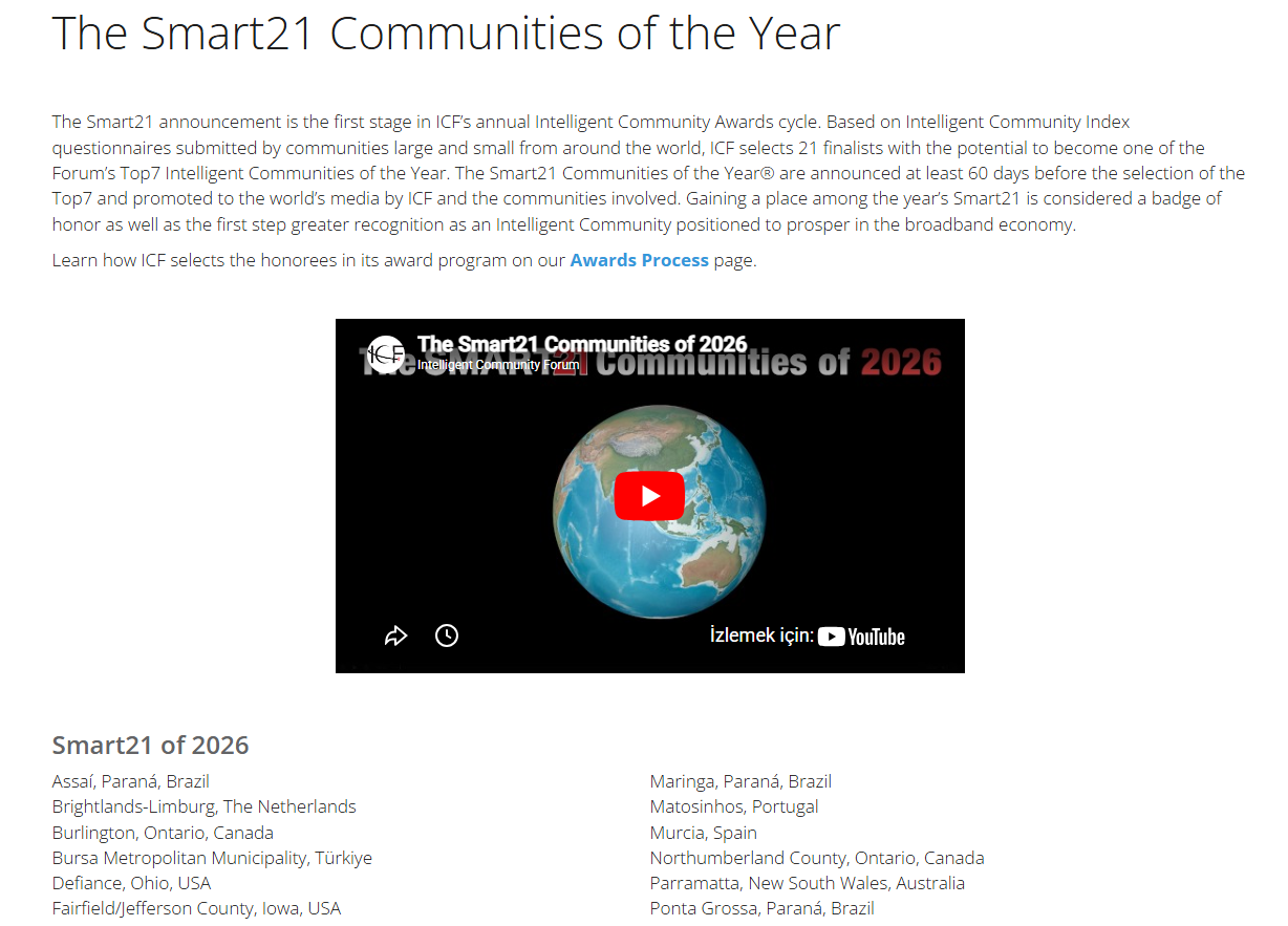 ICF, Smart21 listesinde yer alan kentlerin daha detaylı değerlendirmesini yaparak en başarılı 7 şehri finalist olarak belirleyecek. Bu kentler, Hollanda’da gerçekleşecek konferansta duyurulacak. Daha sonra ABD’de yapılacak küresel zirveyle de ‘Intelligent Community of the Year 2026’ (Yılın En Akıllı Şehri) ödülü verilecek.