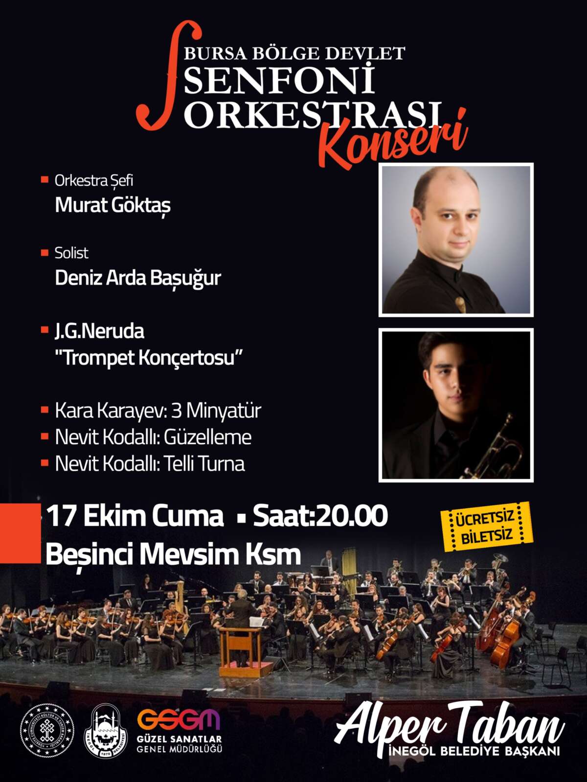 Konserin orkestra şefliğini Murat Göktaş, solistliğini ise genç trompet sanatçısı Deniz Arda Başuğur üstlenecek. Programda, J. G. Neruda’nın “Trompet Konçertosu”, Kara Karayev’in “3 Minyatür” adlı eseri ile Türk bestecisi Nevit Kodallı’nın “Güzelleme” ve “Telli Turna” adlı yapıtları seslendirilecek.