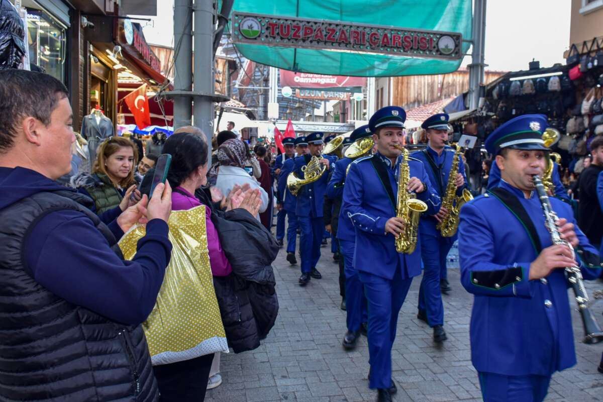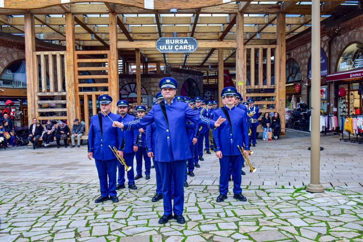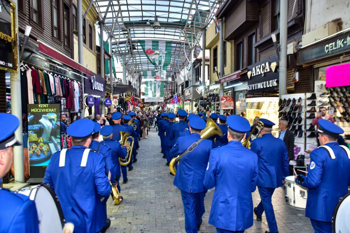 Cumhuriyet’in coşkusunu kentin her tarafına yayarak hissettiren Büyükşehir Belediyesi, kentin tarihi bölgesinde de farklı bir konsere imza attı. Tarihi Hanlar Bölgesi’ndeki çarşılarda marşlar ve kahramanlık ezgileri seslendiren Büyükşehir Belediyesi Bandosu, esnaf ve vatandaşlar tarafından karşılandı. Ellerindeki Türk bayraklarıyla Büyükşehir Bandosu’na eşlik eden Bursalılar, ‘10. Yıl Marşı’, ‘İzmir Marşı’ ve ‘Cumhuriyet’ gibi eserleri hep bir ağızdan söyledi. Cumhuriyet coşkusu, Hanlar Bölgesi’nin tarihi atmosferinde yankılanırken, alışveriş yapan yerli ve yabancı turistlerde Büyükşehir Bandosu’nu büyük bir ilgiyle izledi. Çarşı esnafı, dükkanlarının önüne çıkarak bayraklarla bandoya destek verirken; bazı vatandaşlar da o anları cep telefonlarıyla kaydetti.
