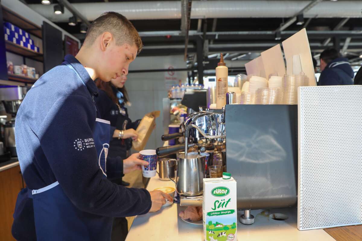 Merinos Parkı’ndaki BURFAŞ B Kafe’de stajyer barista olarak görev yapan 16 yaşındaki Ümit Hazar, barista önlüğünü giyerek personelle birlikte siparişleri titizlikle hazırlıyor. B Kafe’de staj yapmaktan mutluluk duyduğunu söyleyen Hazar, kafeye gelen vatandaşlardan da büyük takdir topluyor.