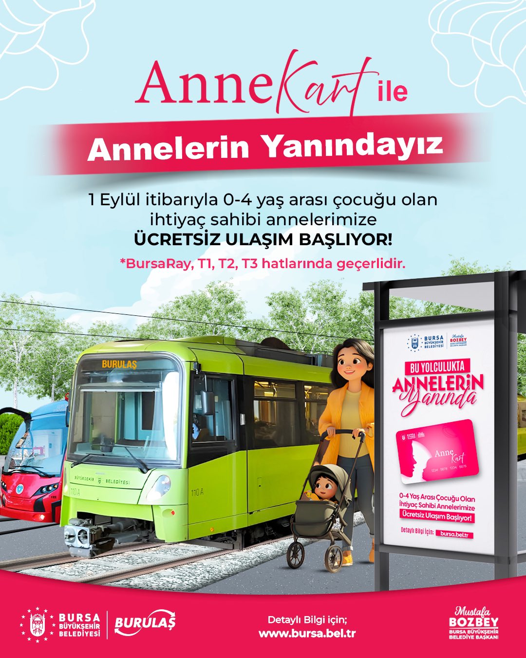 Büyükşehir Belediyesi’nden yapılan açıklamada, 1 Eylül 2025 itibarıyla geçerli olacak uygulama kapsamında, anneler toplu ulaşımda günlük 4 ücretsiz biniş hakkına sahip olacak. AnneKart, BursaRay ile T1, T2 ve T3 hatlarında geçerli olacak. Kart, çocuk yanında olmadan da kullanılabilecek.