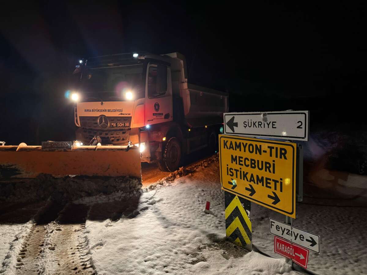 Kar yağışı kent genelinde etkisini gösterirken Bursa Büyükşehir Belediyesi, karla mücadele çalışmaları kapsamında iki vardiya halinde toplam 1021 personel, 203, iş makinesi ve kar küreme aracıyla kardan kapanan 94 mahalle yoluna müdahale etti. Buzlanma riskine karşı ambarlarda hazır bekletilen 14 bin 250 ton tuz ile 30 ton solüsyon da stratejik noktalarda kullanıldı. Çalışmalar kapsamında yoğun kar yağışının etkili olduğu Mustafakemalpaşa’da 3, Kestel’de 11, Keles’te 12, İnegöl’de 21, İznik’te 9, Osmangazi’de 3, Büyükorhan’da 18, Gemlik’te 3, Orhaneli’de 9, Gürsu’da 3 ve Harmancık’ta 2 mahallenin yolu trafiğe açıldı. Kapalı mahalle yolu bulunmazken, ekipler yağışın devam ettiği bölgelerdeki çalışmalarını kesintisiz sürdürüyor.