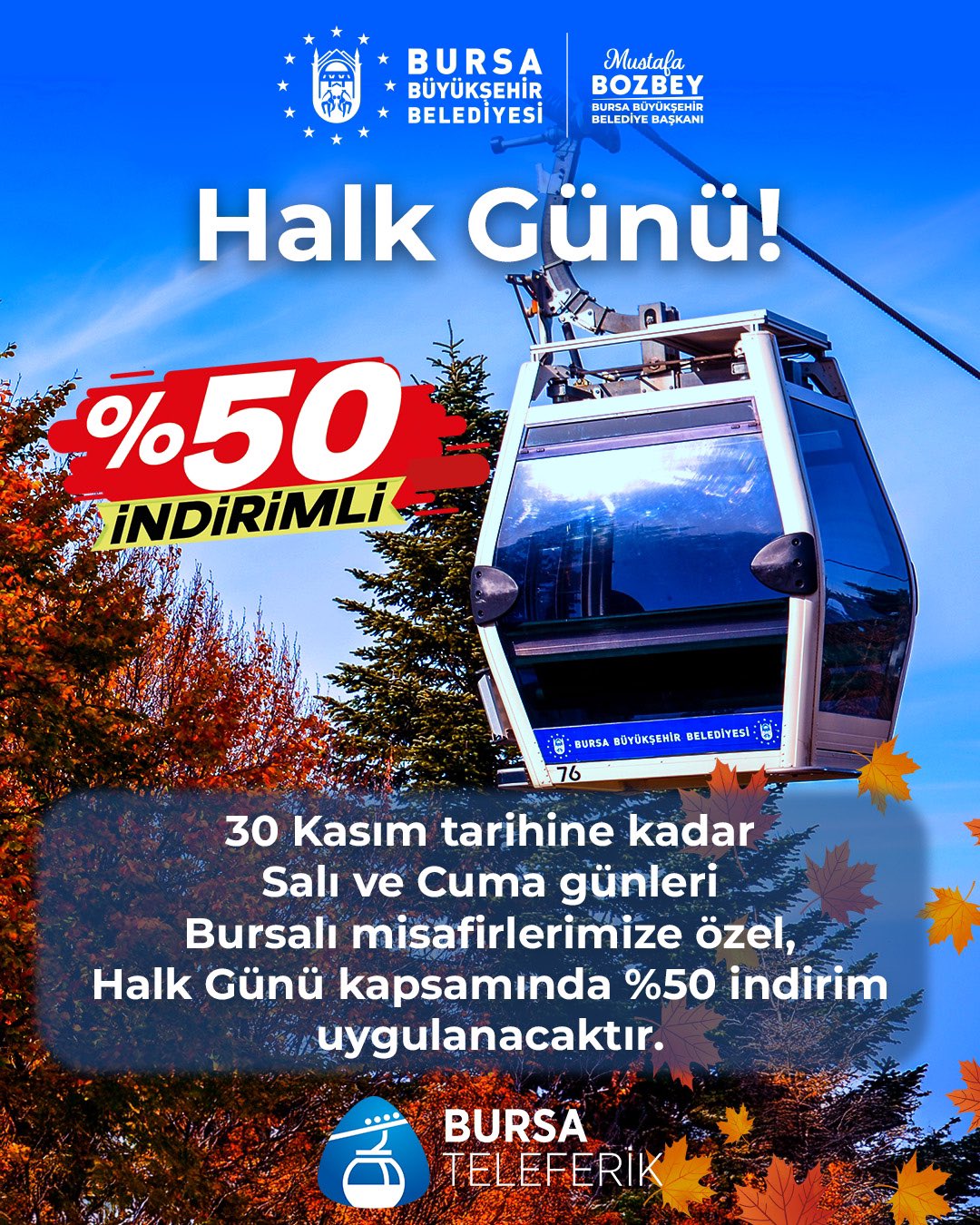 Bursamızı bulutların eşiğinden seyretmek ve Uludağ’ın eşsiz sonbahar manzarasını görmek için ‘Halk Günü’ fırsatıyla teleferik yolculuğuna davetlisiniz.