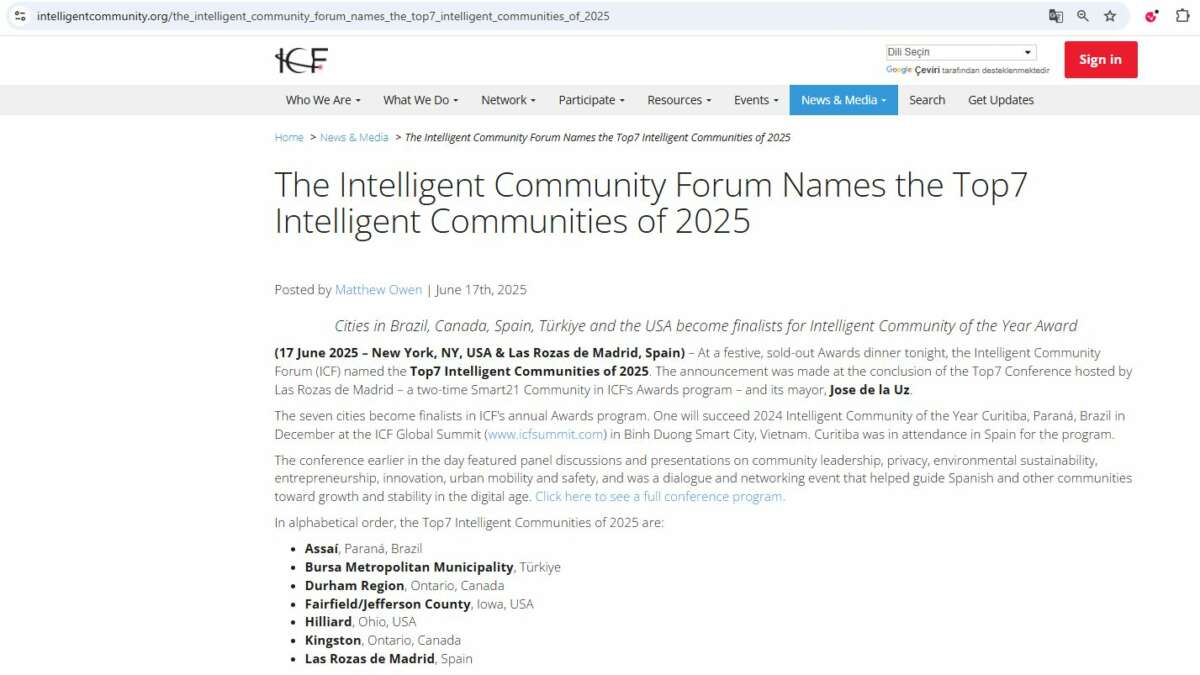 “Türkiye’den Bursa Büyükşehir Belediyesi, 2025 yılında Top7 Intelligent Communities’e girdi. Türkiye’nin kuzeybatısında yer alan Bursa; tarihin yankılarının, modernitenin ritimleriyle uyum içinde olduğu bir şehir olarak öne çıkıyor. Şehir genelinde ücretsiz Wi-Fi, gerçek zamanlı gözetim sistemleri, akıllı aydınlatma ve etkileşimli kent mobilyaları ile Bursa, dijital bağlantıyı ve kamu hizmetlerini önemli ölçüde geliştirdi. Şehir, girişimciliği, teknolojik ilerlemeyi, Endüstri 4.0’ün benimsemesini teşvik eden B-CUBE Akıllı Şehir ve İnovasyon Merkezi ve Bursa Model Fabrikası gibi girişimler aracılığıyla güçlü bir inovasyon ekosistemi kurdu. Bursa ayrıca “Başkan Bozbey Burada’ uygulaması ve ‘Stratejik Plan Anketi’ gibi katılımcı programlar aracılığıyla kapsayıcı yönetimi savunuyor ve halkın kentin geleceğini aktif olarak şekillendirmesini sağlıyor”