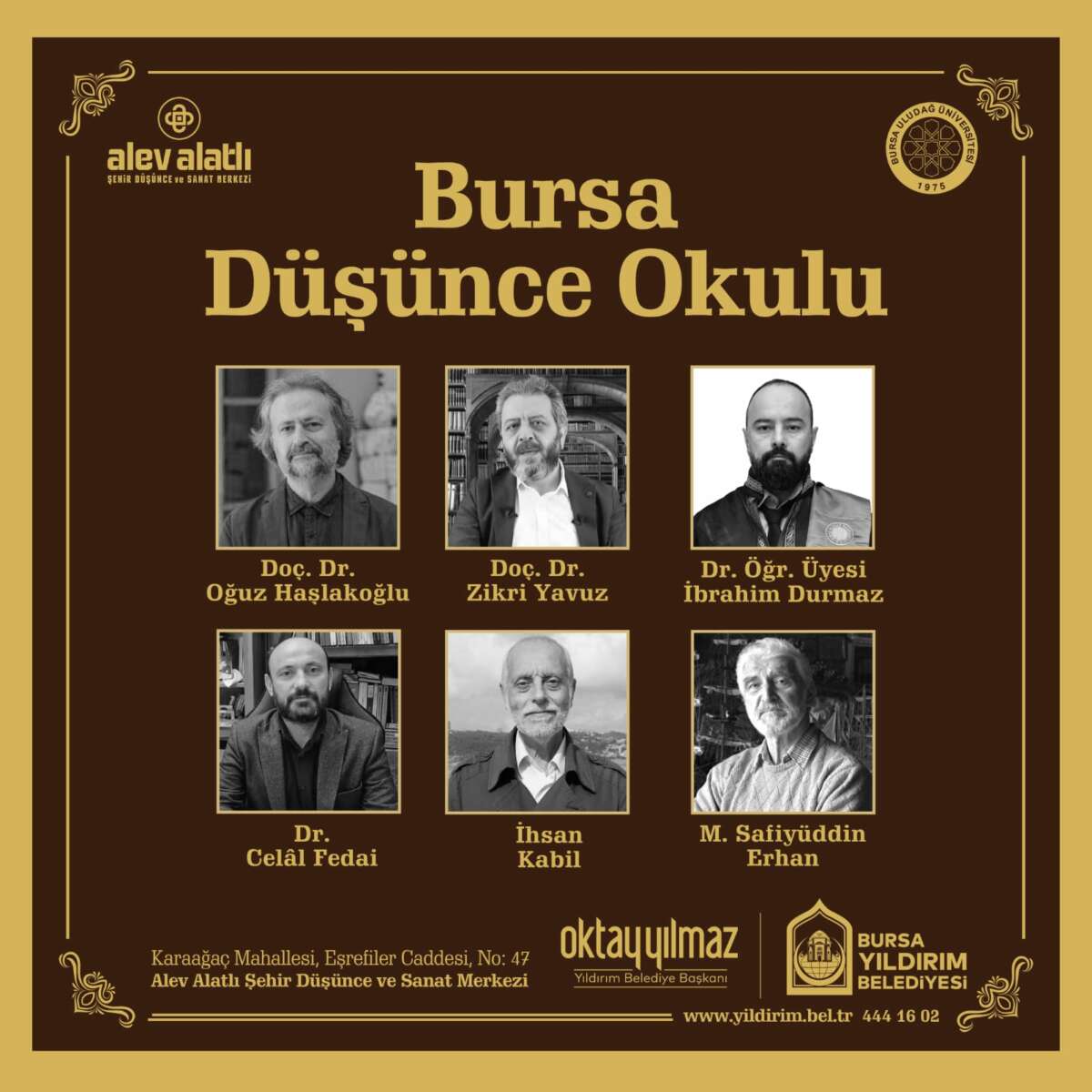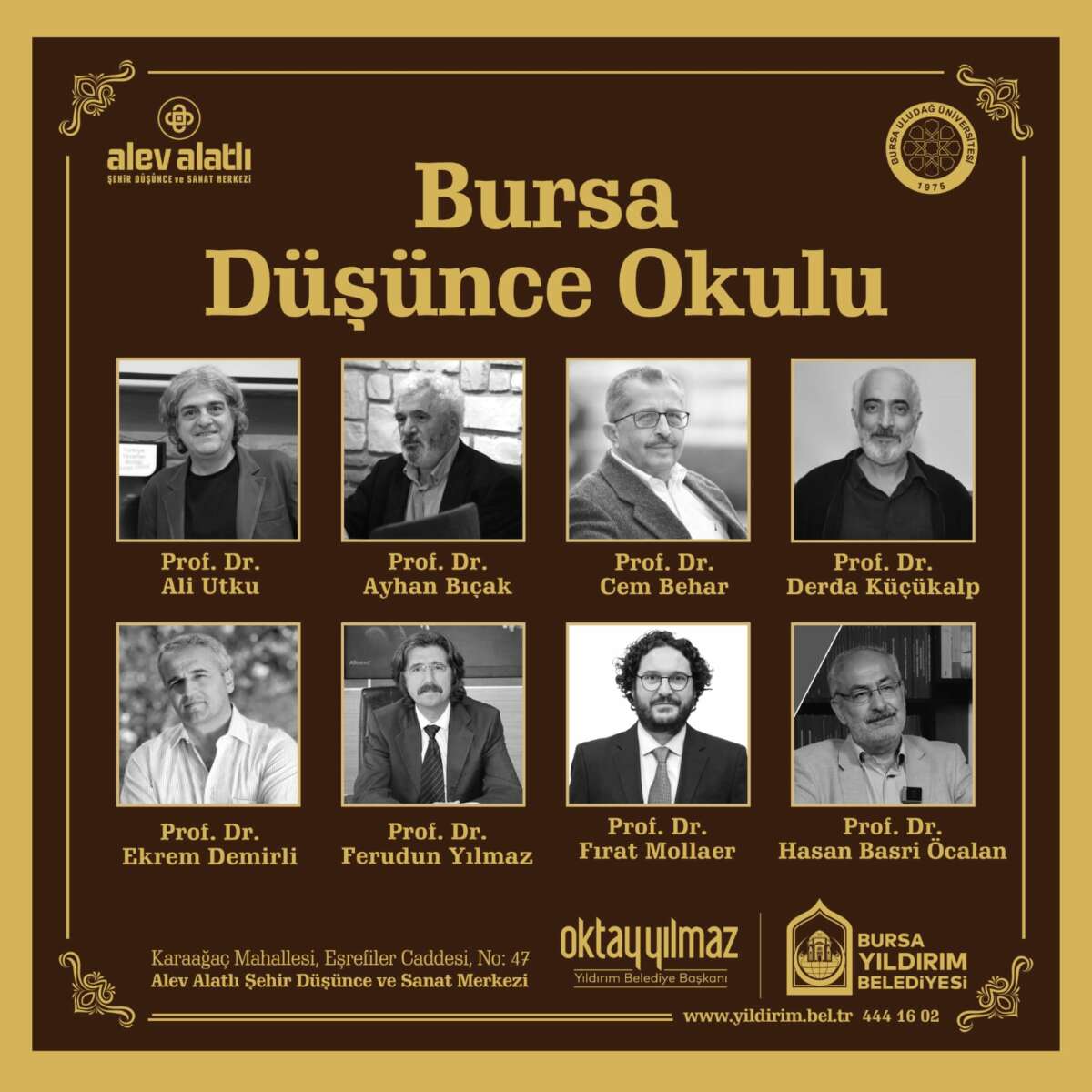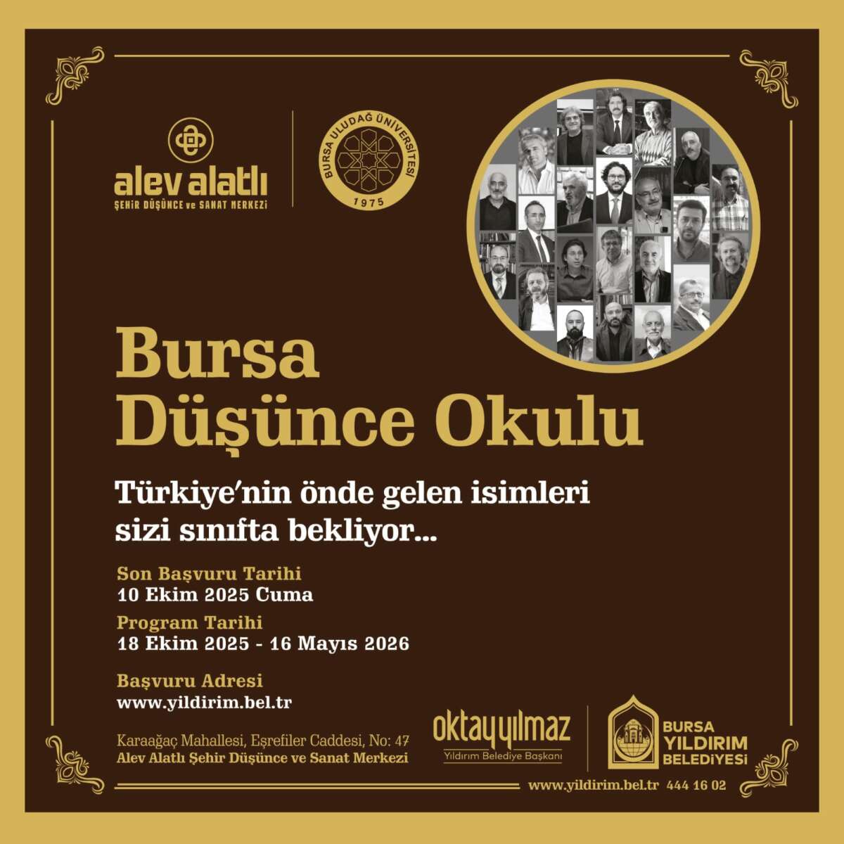 Yıldırım Belediyesi’nin, Uludağ Üniversitesi ile birlikte hayata geçirdiği Bursa Düşünce Okulu’na kayıtlar başladı. 20 hafta boyunca sürecek eğitimlerde; Prof. Dr. Mehmet Fatih Birgül, Prof. Dr. Ekrem Demirli, Prof. Dr. Ali Utku, Prof. Dr. M. Cüneyt Kaya, Prof. Dr. Kasım Küçükalp, Prof. Dr. Tahsin Görgün, Prof. Dr. Ayhan Bıçak, Prof. Dr. Derda Küçükalp, Prof. Dr. Hasan Basri Öcalan, Prof. Dr. Fırat Mollaer, Prof. Dr. Vefa Taşdelen gibi birbirinden değerli isimler, katılımcıları bilgilendirecek. Katılımcıların kendilerini çok yönlü geliştirebilmelerini ve okumaya, araştırmaya, düşünmeye daha fazla vakit ayırabilmelerini sağlamak amacıyla düzenlenen Bursa Düşünce Okulu’na katılım için 10 Ekim tarihine kadar, Yıldırım Belediyesi resmi internet sitesinin duyurular bölümünden başvuru yapılabilecek. Adaylar arasından 11-12 Ekim tarihleri arasında gerçekleştirilecek mülakat ile katılımcılar belirlenecek. ‘Düşünce-Bilgi-Bilim’, ‘Medeniyet-Kültür-Tarih’ ve ‘Sanat-Edebiyat-Ahlak’ başlıkları altında oluşturulan dersler 18 Ekim’de başlayacak ve 16 Mayıs’ta son bulacak. Bursa Düşünce Okulu’nu başarı ile tamamlayan katılımcılara da sertifikaları yine 16 Mayıs’ta Yıldırım Belediye Başkanı Oktay Yılmaz tarafından verilecek.
