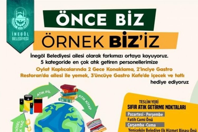 İnegöl Belediyesi sıfır atık uygulamaları kapsamında düzenlediği farkındalık etkinliklerine bir yenisini daha ekledi. Bu defa “Önce Biz, Örnek Biziz” sloganıyla personellerine yönelik bir yarışma düzenleyen İnegöl Belediyesi, 5 ayrı kategoride toplanacak atıklarla en fazla puan alan 3 personeli ödüllendirecek.