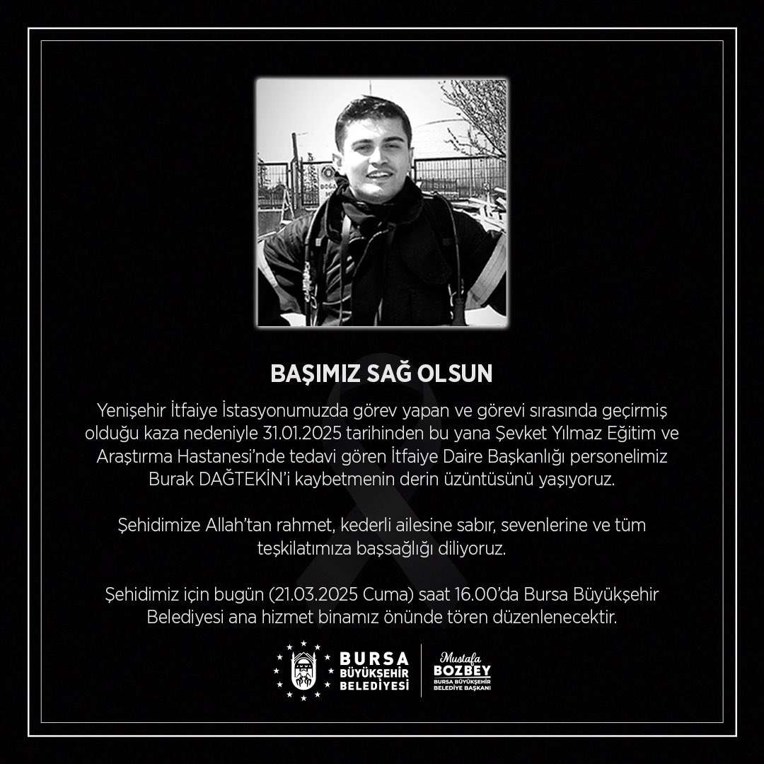 “Yenişehir İtfaiye İstasyonumuzda görev yapan ve görevi sırasında geçirmiş olduğu kaza nedeniyle 31.01.2025 tarihinden bu yana Şevket Yılmaz Eğitim ve Araştırma Hastanesi’nde tedavi gören İtfaiye Daire Başkanlığı personelimiz Burak DAĞTEKİN’i kaybetmenin derin üzüntüsünü yaşıyoruz.