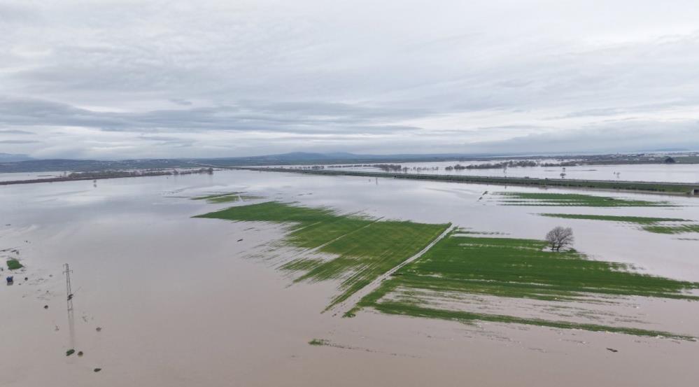 Dron ile kaydedilen görüntülerde, tarım arazilerinin büyük bölümünün suyla kaplandığı dikkat çekerken, taşkının boyutu havadan daha net şekilde ortaya kondu.