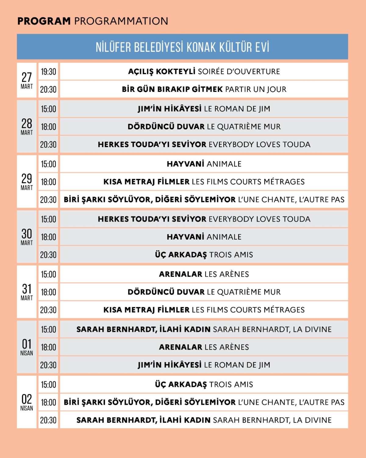 Program kapsamında ayrıca 29 Mart ve 31 Mart tarihlerinde gerçekleştirilecek özel kısa metraj film seçkileri de sinemaseverlere farklı ve zengin bir izleme deneyimi sunacak.