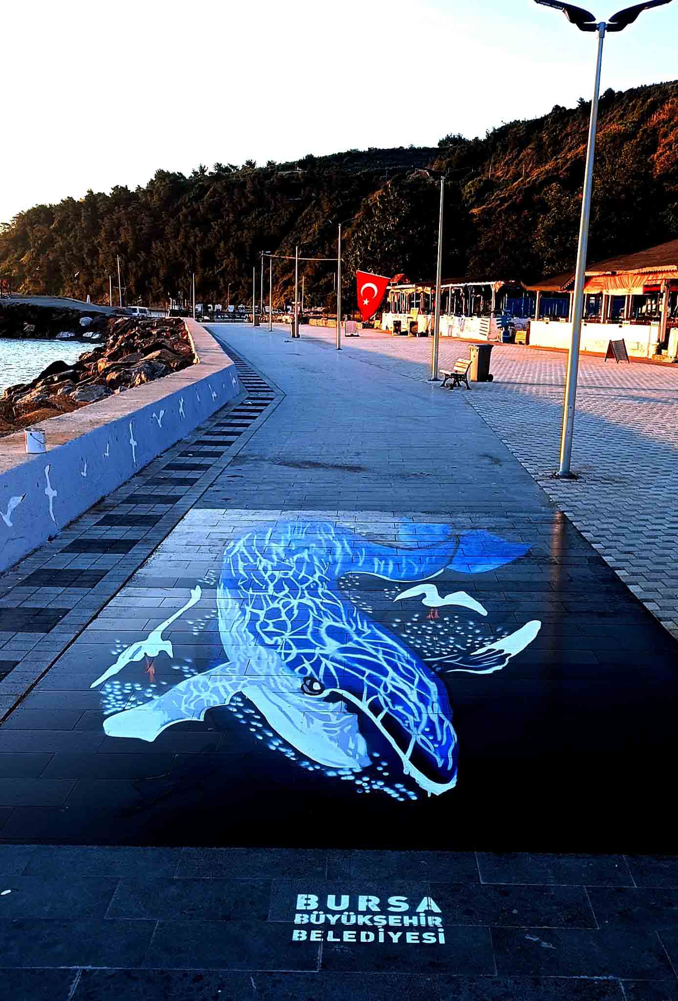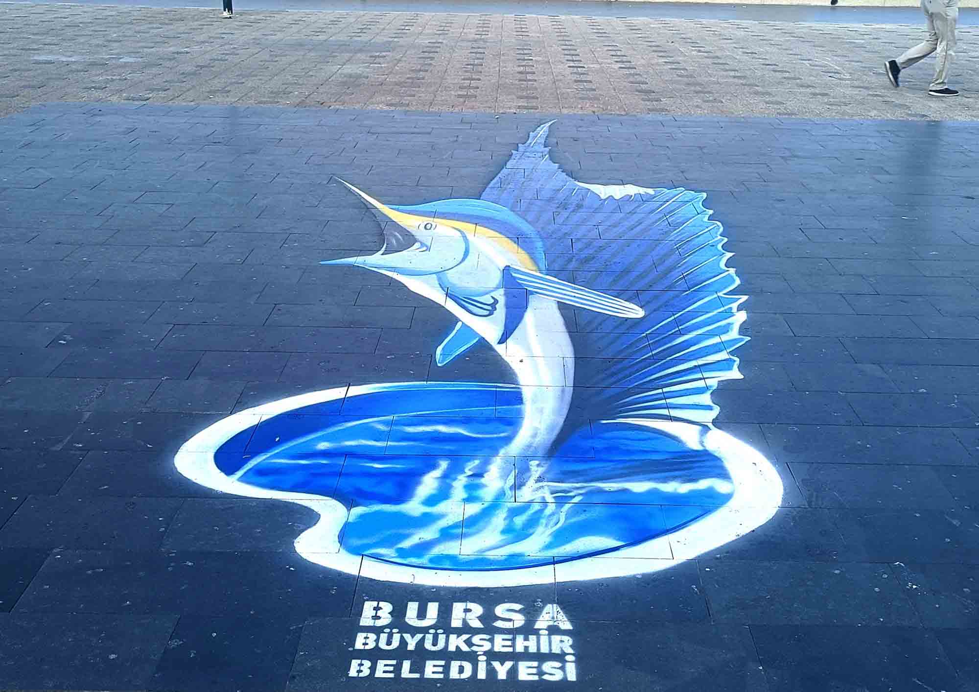 Bursa’nın estetik bir kent olması ve sanatla buluşması amacıyla çalışmalarını sürdüren Büyükşehir Belediyesi, cadde ve meydanlardaki modern kent imajını güçlendirmek için Kent Estetiği Şube Müdürlüğü bünyesindeki ressamlarıyla her geçen gün yeni çalışmalara imza atıyor. Türkiye’de halen yaygın olmayan, Avrupa’daki örneklerinde ise daha çok tebeşir gibi geçici boyalarla yapılan 3 boyutlu uygulamalar, Bursa’da vatandaşların uzun süre etkileşim halinde fotoğraflar çekebilmesi amacıyla dayanıklı özel boyalarla resmediliyor. 3D sokak boyama sanatı çalışmaları belli bir açıdan bakıldığında vatandaşlara şaşkınlık yaşatıyor. Boyaması tamamlanan Gemlik sahilindeki 3D kılıç balığı, Mudanya sahilindeki 3D martı ve Tirilye sahilindeki 3D Balina uygulamaları görenleri gülümsetiyor. Vatandaşlardan da olumlu tepkiler alan yeni 3 boyutlu sanat uygulamaları, özellikle yaya hareketliliğinin yoğun olduğu bölgelerde yaygınlaştırılacak.