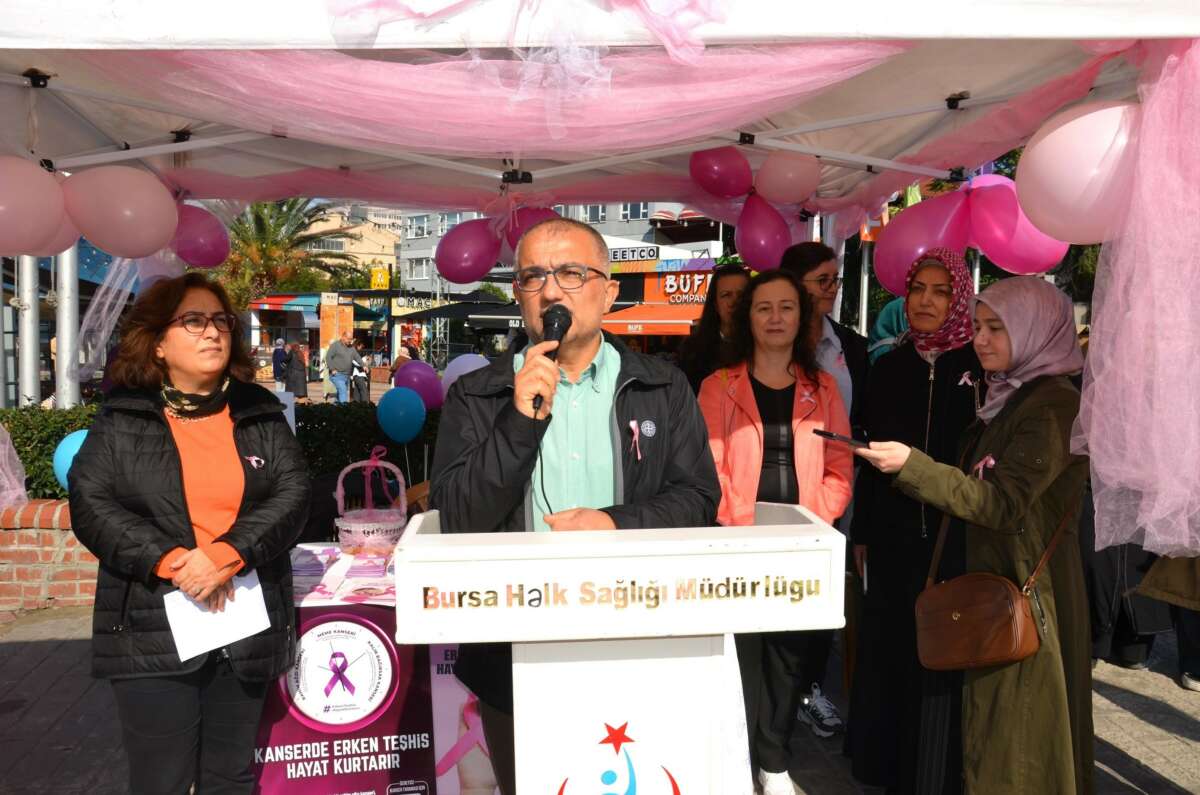 Yürüyüşün ardından Zafer Meydanı’nda konuşan Bursa Halk Sağlığı Hizmetleri Başkanı Dr. İrfan Oğuz, meme kanseri konusunda toplumsal bir bilinç oluşturabilmek adına etkinliği düzenlediklerini söyledi. Meme kanserinin kadınlarda kanser türlerinin içerisinde ölüm nedenlerinde ilk sıralarda geldiğini hatırlatan Dr. Oğuz, ‘Bu çerçevede bizler de geçen sene sağlıklı hayat merkezlerimiz ve ikinci basamak kuruluşlarımızda 276 binden fazla kişiye kanser taraması yaptık. Bunların arasında meme kanseri, kolorektal ve rahim ağzı kanseri olmak üzere, 210 kişide kanser erken dönemde teşhis edildi. İşin sadece mali boyutunu düşünsek bile bir kanser hastasını erken dönemde yakalamak hem hasta, hem devletimiz için birçok mali yükten kurtulmak demektir. Bunun yanında kanser hastalığının sosyal ve psikolojik kısımları da fazlasıyla yıpratıcı olmaktadır” diye konuştu.