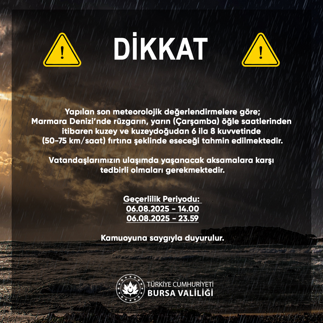 Giriş: 05-08-2025 16:53 Kaynak: kaynak Bursa + - ABONE OL Valilikten yapılan açıklamada, olumsuz hava koşullarına karşı tedbirli olunması gerektiği vurgulanarak şu ifadelere yer verildi: