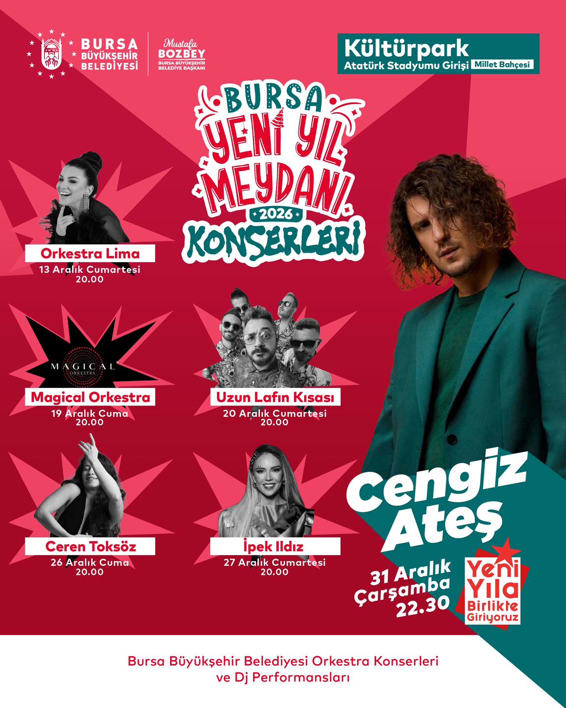 Vatandaşların huzur ve güven içerisinde 2026’yı karşılayabilmeleri için Bursa Kültür AŞ ve ilgili birimleriyle hazırlıklarını sürdüren Bursa Büyükşehir Belediyesi, yeni yılın büyük bir coşkuyla karşılanması için Eski Atatürk Stadyumu alanında ‘Bursa Yeni Yıl Meydanı’nı oluşturdu. Yeni Yıl Meydanı, 13-31 Aralık tarihlerinde gerçekleştirilecek olan birbirinden eğlenceli etkinlikler, özel tasarlanmış stantlar, tematik alanlar, ışıklandırmalar ve aktivitelerle kentin sosyal yaşamına önemli bir katkı sağlayacak.
