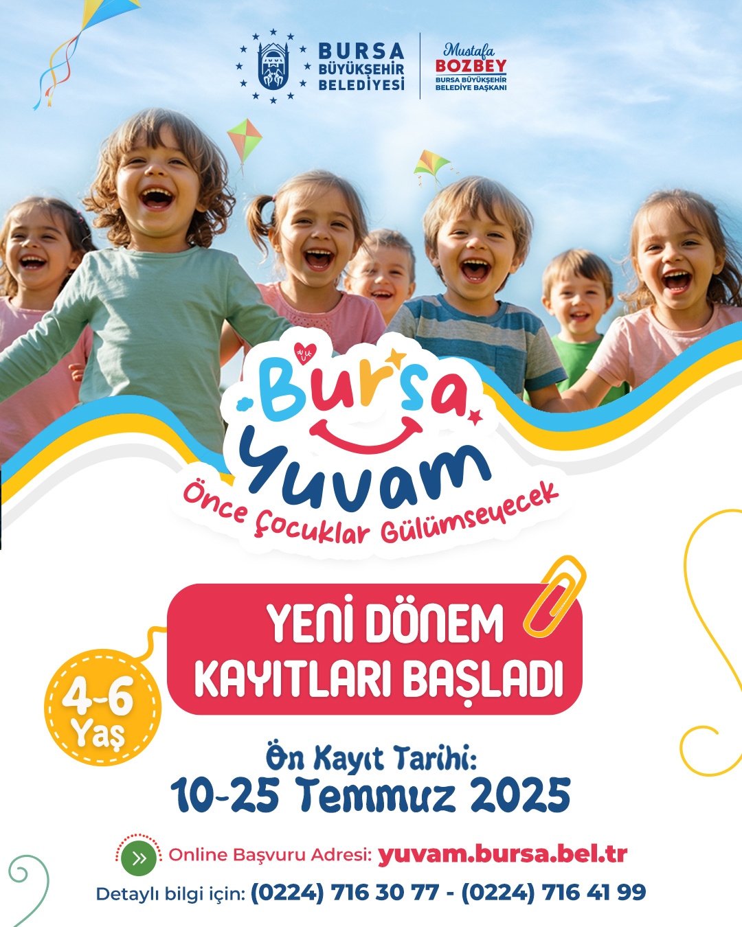 Bursa Büyükşehir Belediyesi, 2025-2026 eğitim döneminde okul öncesi eğitim hizmeti alamayan 4-6 yaş aralığındaki (48-68 aylık) binlerce çocuğa, ‘Bursa Yuvam Çocuk Etkinlik Merkezleri’nde eğitim vermeye hazırlanıyor. Sabah ve öğlen olmak üzere ikili sistemde eğitim hizmeti sunulan 32 merkezde, her gün sabah ve öğlen gruplarına ara öğün verilecek. Öğrencilerin çanta ve kırtasiye malzemeleri de Bursa Büyükşehir Belediyesi tarafından karşılanacak. Öğrencilerin okul dışı öğrenme ortamlarına, dış alan gezi ve ziyaretlerine katılımları da sağlanacak. Yıl içerisinde şube sayısının arttırılmasının hedeflendiği merkezlere, 10-25 Temmuz tarihleri arasında kayıt yaptırılabilecek. Detaylı bilgi ve başvuru için https://yuvam.bursa.bel.tr/ adresi ziyaret edilebilir.