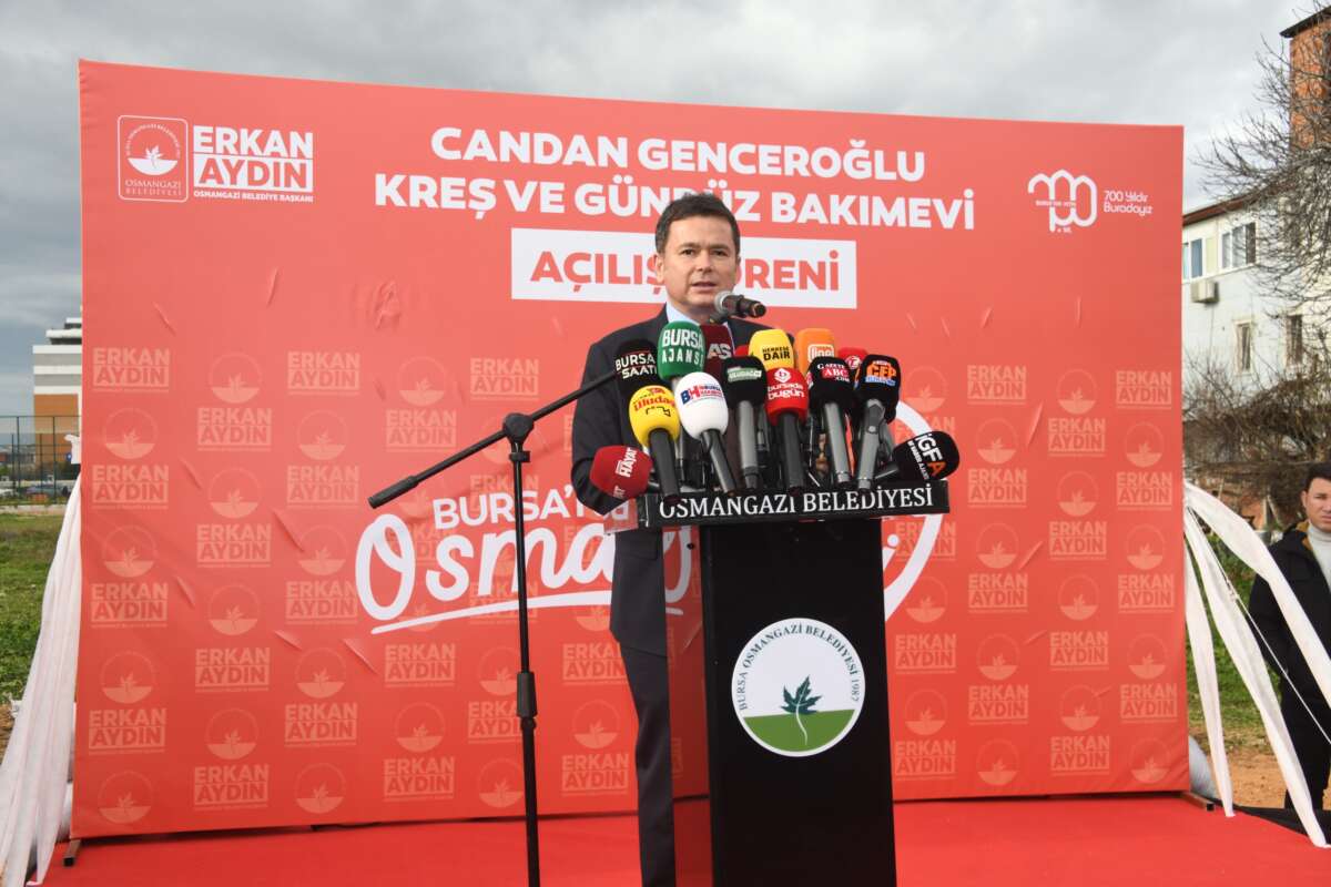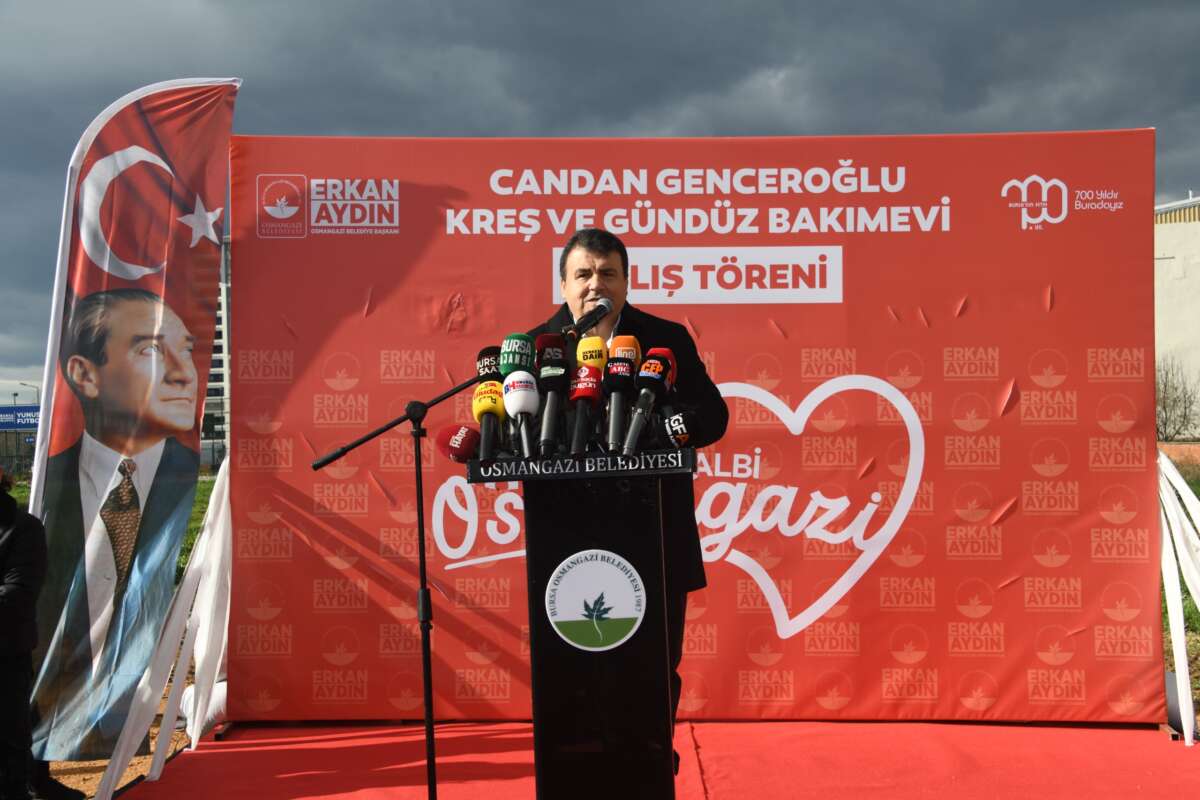 Çocukların güvenli, çağdaş ve nitelikli ortamlarda eğitim almasının büyük önem taşıdığını vurgulayan Osmangazi Belediye Başkanı Erkan Aydın, konuşmasına şu şekilde devam etti: “Birlikte görev yaptığımız partimizin Türkiye Büyük Millet Meclisi’ndeki gururu mücadelesiyle bütün herkesin haklarını savunmasıyla hepimize güzel örnek olan değerli dostum Ali Mahir Başarır, açılışımıza katıldığı için çok teşekkür ediyorum. Şuanda 4’üncü kreşimizin açılışını yapmaktayız. Bir tanesinin daha yapımı bitti onunda bir kaç hafta içinde açılışını yapacağız. Bir diğerinin de Şubat Mart gibi açılışını yapmayı düşünüyoruz. 2 yılda toplam 6 kreşe ulaşmış olacağız. 4 tane kreşimizin de hafriyat işlemleri bitti temel atmasını yaparak bir daha ki yıl