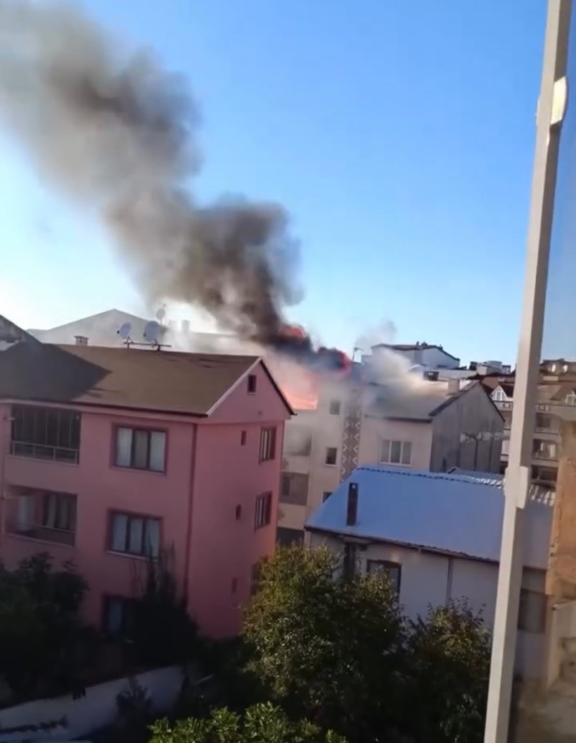 Yangında can kaybı yaşanmazken, çatı kullanılamaz hale geldi. O anlar ise çevredeki vatandaşların cep telefonu kameralarına yansıdı.
