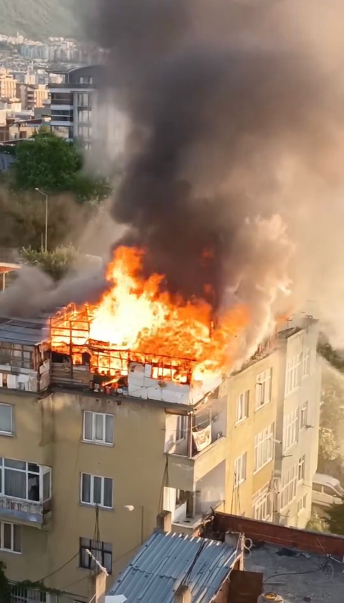 Bursa'da 5 katlı binanın çatı katı alevlere teslim oldu. Yangın, itfaiye ekiplerinin müdahalesiyle diğer binalara sıçramadan söndürüldü.