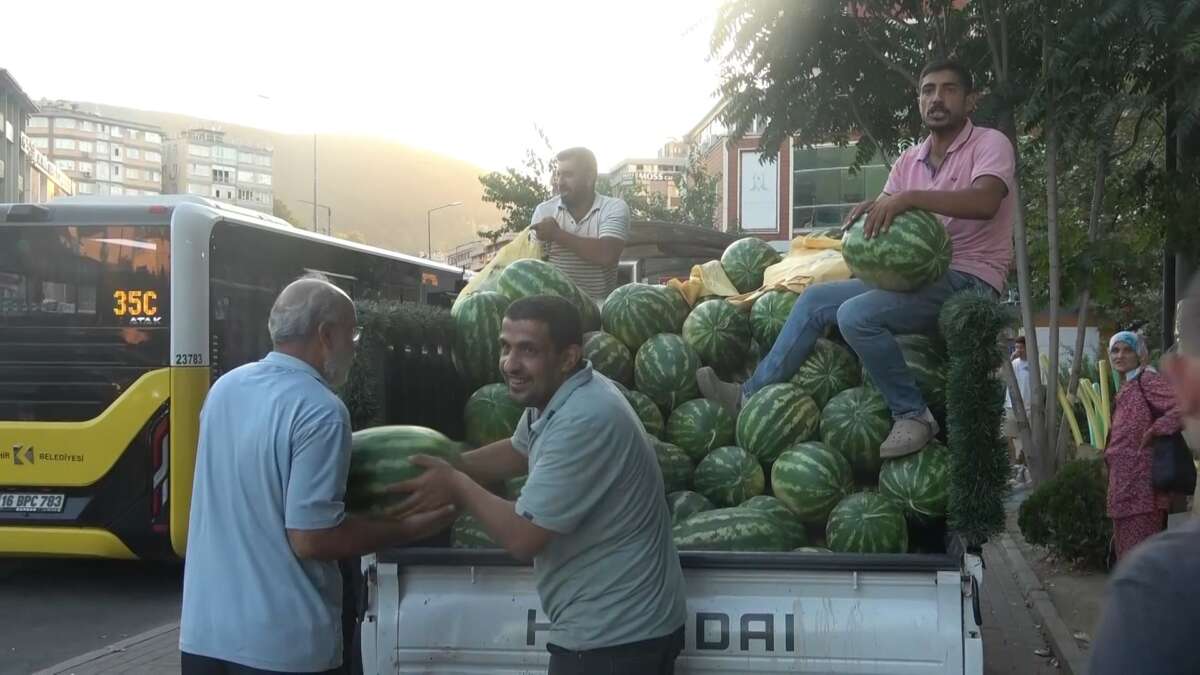 Bursa’da bir zücaciye mağazası, sıcak yaz günlerinde bunalan vatandaşlara serinlemeleri için ücretsiz karpuz dağıttı. Mağazaların önünde 4 kamyon, yaklaşık 20 tonu bulan karpuzlar 25 dakika içinde tükendi. Mağaza sahibi Bekir Yetişen, “Yıllardır bizimle alışveriş yapan müşterilerimizin bu sıcak yaz günü akşamında serinlemelerini istedik” dedi.