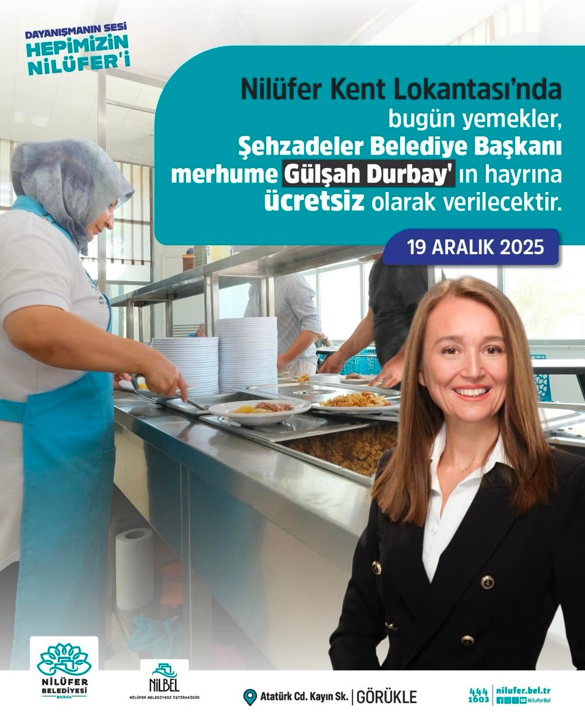 Belediyenin sosyal medya hesaplarından paylaşılan bilgilere göre, Görükle’de bulunan Nilüfer Kent Lokantası bugün saat 13.00’te kapılarını açacak ve 17.00’ye kadar ücretsiz hizmet verecek.