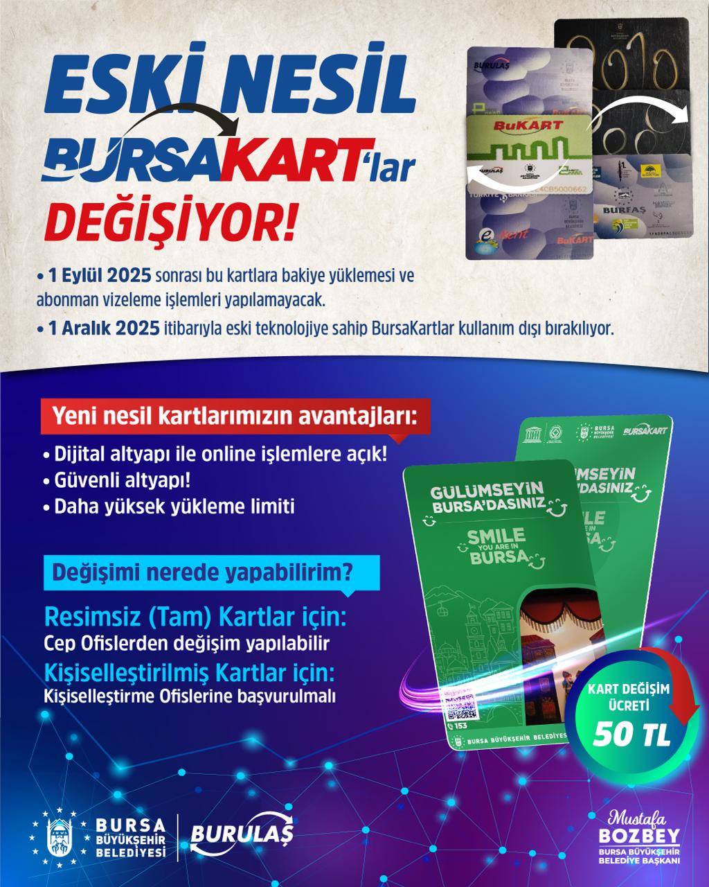 Yapılan açıklamaya göre, yeni Bursakart yolculara hız, kolaylık ve çeşitli avantajlar sunacak. 1 Eylül 2025’ten itibaren eski nesil kartlara bakiye yükleme ve abonman işlemleri durdurulacak, 1 Aralık 2025 itibarıyla ise eski kartlar tamamen kullanımdan kaldırılacak.