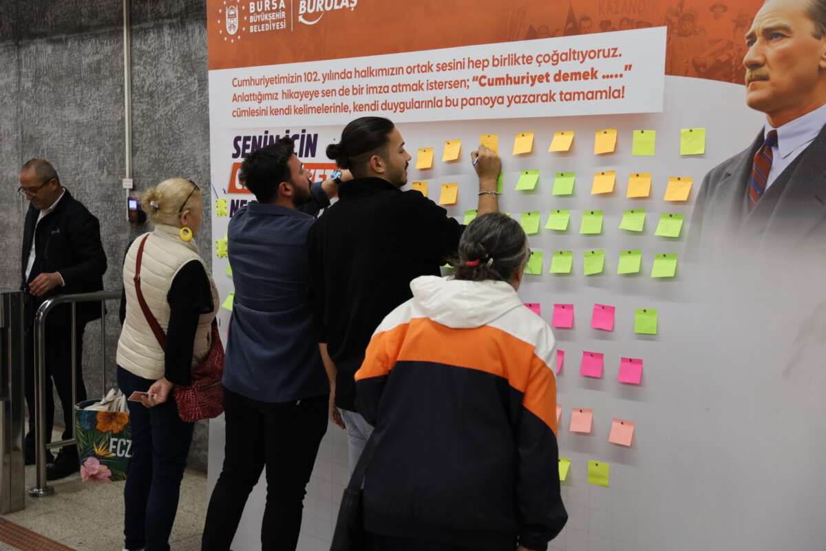 Türkiye Cumhuriyeti’nin 102’nci kuruluş yıl dönümünü büyük bir coşkuyla kutlamaya hazırlanan Bursa Büyükşehir Belediyesi’nin halkın katılımını merkeze alan bir anlayışla başlattığı ‘Cumhuriyet demek…’ kampanyası tüm hızıyla sürüyor. Proje kapsamında ‘cumhuriyetdemek.com’ web sitesini ziyaret eden vatandaşlar, “Cumhuriyet demek…” cümlesini kendi duygu ve düşünceleriyle tamamlayarak paylaşıyor. Yapılan değerlendirme sonucunda ‘Bir Çift Mavi Göz’, ‘Özgürlük ve Bağımsızlık’, ‘Kayıtsız Şartsız Egemenlik’, ‘Evladıma Miras’, ‘İnanç ve Cesaret’, ‘Boyun Eğmemek’, ‘Demokrasi’, ‘Çocuğumun Gülüşü’, ‘Kadının Sesi’, ‘Fırsat Eşitliği’, ‘Gülümseyen Gençlik’, ‘Mücadele ve Zafer’, ‘Hak, Hukuk, Adalet’, ‘Vatan Sevgisi’, ‘Bilimle Aydınlanmak’ ve ‘Devrimlerin İzinde Olmak’ sloganları belirlendi. Dijital kampanyaya katılan vatandaşların duygu ve düşünceleri, Cumhuriyet coşkusunu kentin tüm sokaklarına taşıdı. Sloganları sergilenmeye değer görülen vatandaşlar, Sıcak Su mevkiindeki billboardlara kendi ifadelerini sprey boyayla yazdı.