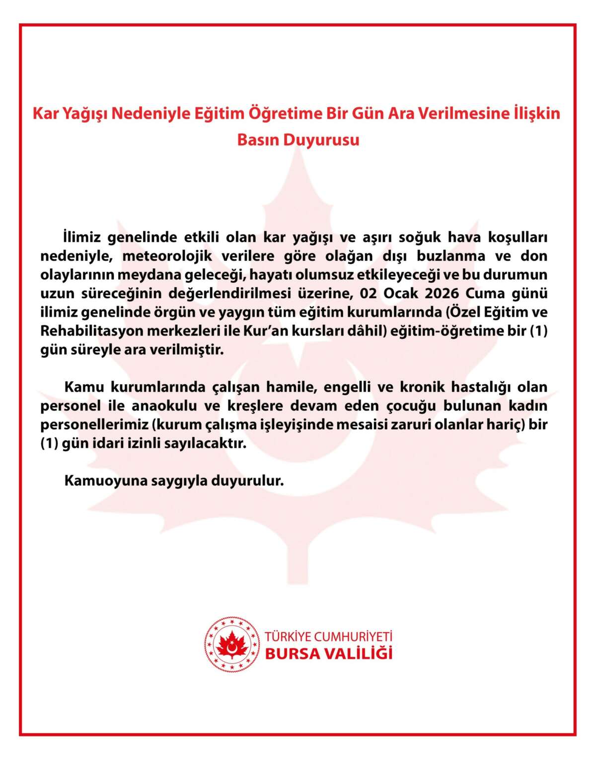 Bursa Valiliğinden yapılan açıklamada, “İlimiz genelinde etkili olan kar yağışı ve aşırı soğuk hava şartları sebebiyle, meteorolojik verilere göre olağan dışı buzlanma ve don olaylarının meydana geleceği, hayatı olumsuz etkileyeceği ve bu durumun uzun süreceğinin değerlendirilmesi üzerine, 2 Ocak 2026 Cuma günü ilimiz genelinde örgün ve yaygın tüm eğitim kurumlarında (Özel Eğitim ve Rehabilitasyon merkezleri ile Kur’an kursları dahil) eğitim-öğretime 1 gün süreyle ara verilmiştir. Kamu kurumlarında çalışan hamile, engelli ve kronik hastalığı olan personel ile anaokulu ve kreşlere devam eden çocuğu bulunan kadın personellerimiz (kurum çalışma işleyişinde mesaisi zaruri olanlar hariç) 1 gün idari izinli sayılacaktır” denildi.