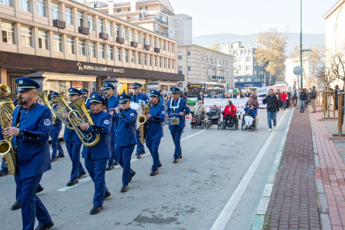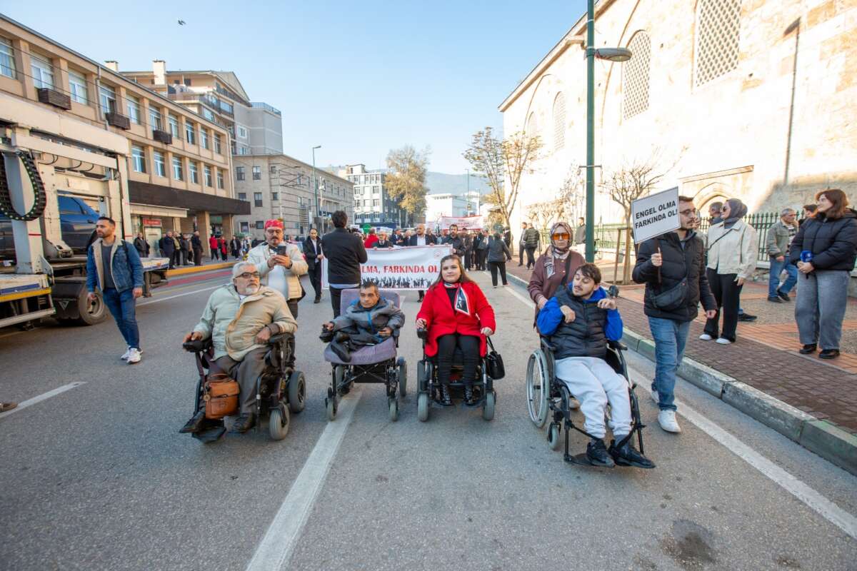 Dünya Engelliler Günü kapsamında ‘Engelli Farkındalık Yürüyüşü’ düzenlendi. Ulu Cami önünde bir araya gelen özel gereksinimli bireylere Bursa Büyükşehir Belediye Başkanı Mustafa Bozbey’i temsilen Büyükşehir Belediyesi Genel Sekreter Yardımcısı Mehmet Yıldız, Bursa Vali Yardımcısı Mustafa Güney, Bursa Kent Konseyi Başkanı Prof. Dr. Ertuğrul Aksoy, sivil toplum kuruluşlarının temsilcileri ve vatandaşlar eşlik etti. ‘Farklılıklarımızla Daha Güçlüyüz’ yazılı pankart taşıyan vatandaşlar, ellerindeki dövizlerle ‘Engel olma, farkında ol’ mesajı verdi. Büyükşehir Belediye Bandosu’nun da eşlik ettiği yürüyüş, Atatürk Anıtı’nda sona erdi. Saygı duruşu ve İstiklal Marşı’nın ardından çelenk sunumu gerçekleştirildi.
