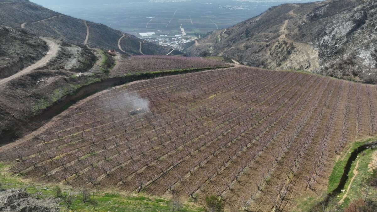 Yükseltilerin arasında, binlerce dekar griye çalan alanın ortasında göz kamaştırıcı bir manzara, bir umut isyanı yükseliyor. Yangının pençesinden sahiplerinin bakımları sayesinden kurtulan, dağların kuytusunda saklı 50 dönümlük şeftali bahçeleri, baharın gelişiyle pembe çiçeklere durdu ve büyüleyici bir görsel şölen sundu.